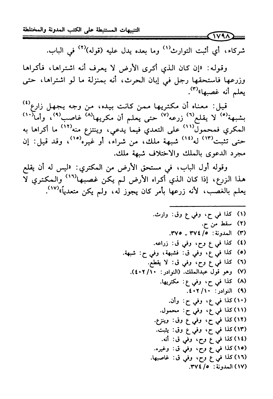 وقوله أول الباب، في مستحق الأرض من المكتري: "ليس له أن يقلع هذا الزرع، إذا كان الذي أكراه الأرض لم يكن غصبها (¬16) والمكتري لا يعلم بالغصب، لأنه زرعها بأمر كان يجوز له، ولم يكن متعدياً" (¬17).