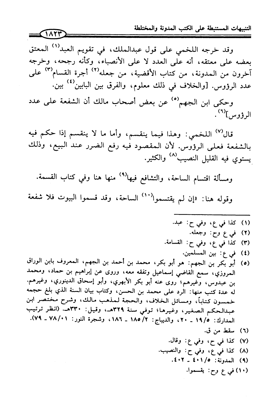 (¬5) أبو بكر بن الجهم: هو أبو بكر، محمد بن أحمد بن الجهم، المعروف بابن الوراق المروزي، سمع القاضي إسماعيل وتفقه معه، وروى عن إبراهيم بن حماد، ومحمد بن عبدوس، وغيرهم؛ روى عنه أبو بكر الابهري، وأبو إسحاق الدينوري، وغيرهم. له عدة كتب منها: الرد على محمد بن الحسن، وكتاب بيان السنة الذي بلغ حجمه خمسون كتاباً، ومسائل الخلاف، والحجة لمذهب مالك، وشرح مختصر ابن عبد الحكم الصغير، وغيرها؛ توفي سنة 329 هـ، وقيل: 330 هـ. (انظر ترتيب المدارك: 5/ 19 - 20، والديباج: 2/ 185 - 186، وشجرة النور: 1/ 78 - 79).