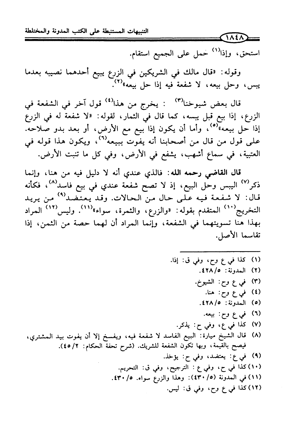 (¬11) في المدونة (5/ 430): وهذا والزرع سواء. 5/ 430.