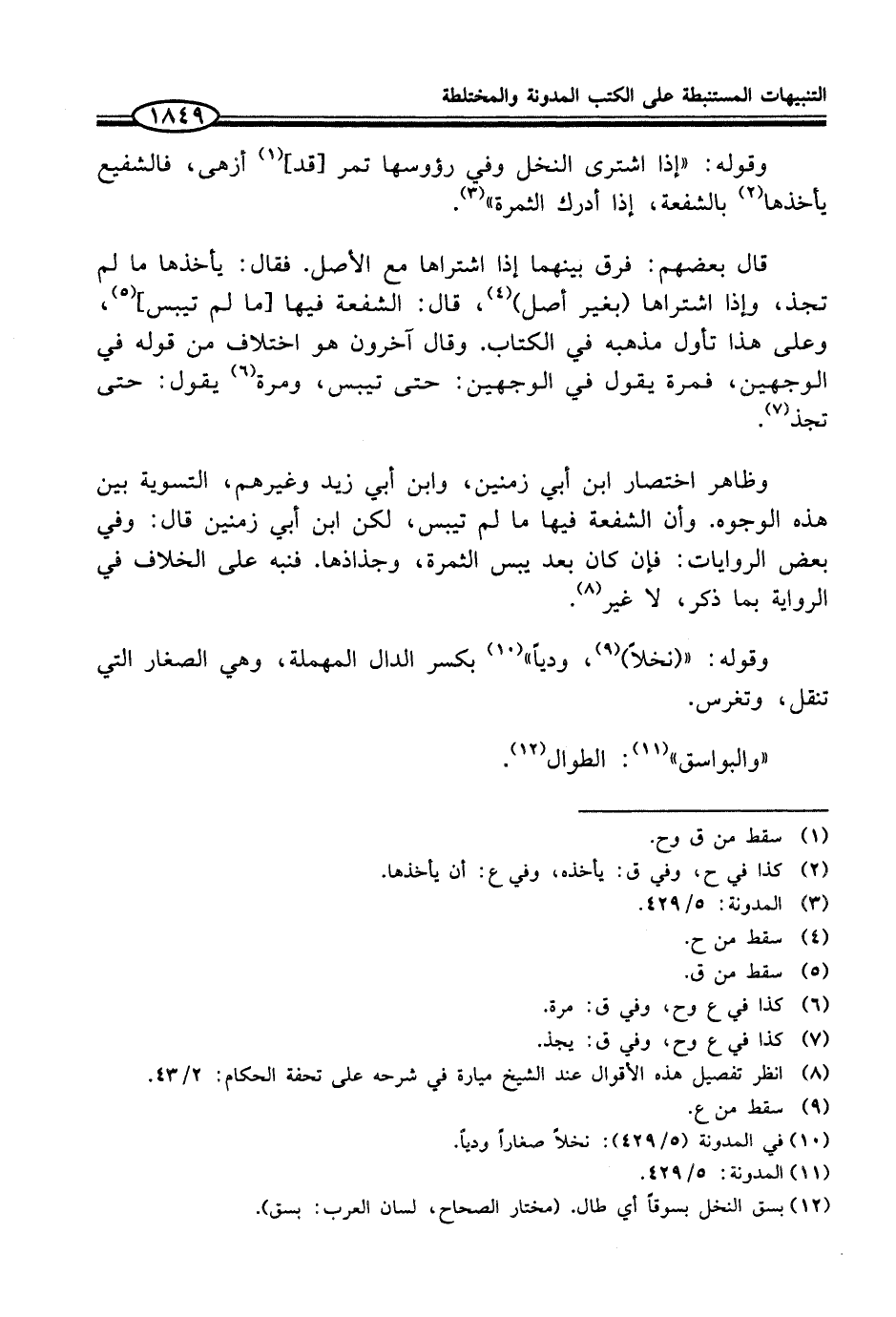 وظاهر اختصار ابن أبي زمنين، وابن أبي زيد وغيرهم، التسوية بين هذه الوجوه. وأن الشفعة فيها ما لم تيبس، لكن ابن أبي زمنين قال: وفي بعض الروايات: فإن كان بعد يبس الثمرة، وجذاذها. فنبه على الخلاف في الرواية بما ذكر، لا غير (¬8).