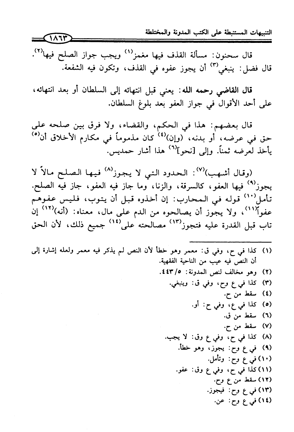 (وقال أشهب) (¬7): الحدود التي لا يجوز (¬8) فيها الصلح مالاً لا يجوز (¬9) فيها العفو، كالسرقة، والزنا، وما جاز فيه العفو، جاز فيه الصلح. تأمل (¬10) قوله في المحارب: إن أخذوه قبل أن يتوب، فليس عفوهم عفواً (¬11)، ولا يجوز أن يصالحوه من الدم على مال، معناه: (أنه) (¬12) إن تاب قبل القدرة عليه فتجوز (¬13) مصالحته على (¬14) جميع ذلك، لأن الحق
