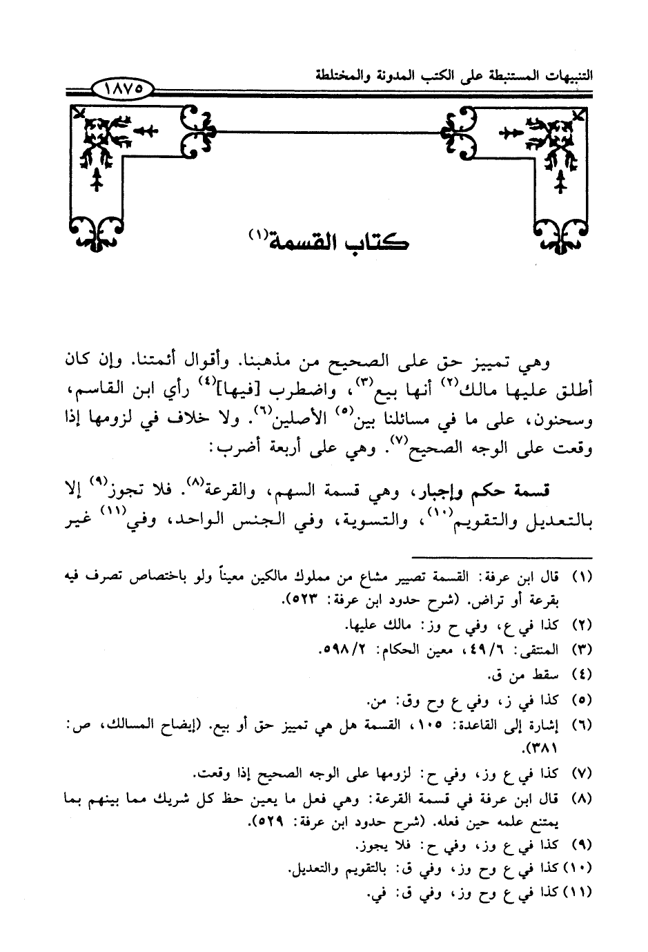 (¬1) قال ابن عرفة: القسمة تصيير مشاع من مملوك مالكين معيناً ولو باختصاص تصرف فيه بقرعة أو تراض. (شرح حدود ابن عرفة: 523).