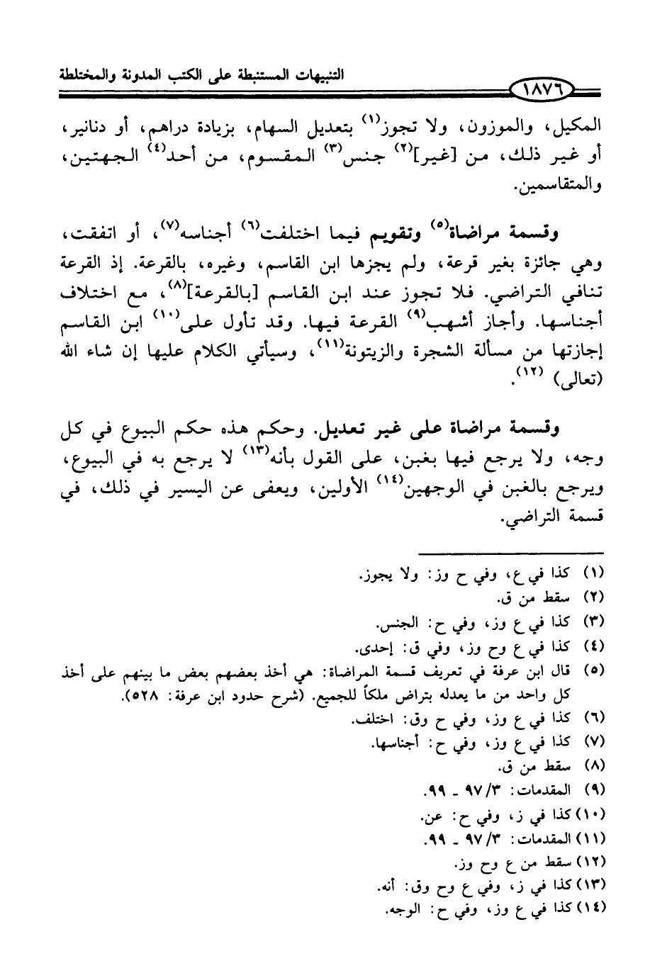(¬5) قال ابن عرفة في تعريف قسمة المراضاة: هي أخذ بعضهم بعض ما بينهم على أخذ كل واحد من ما يعدله بتراض ملكاً للجميع. (شرح حدود ابن عرفة: 528).