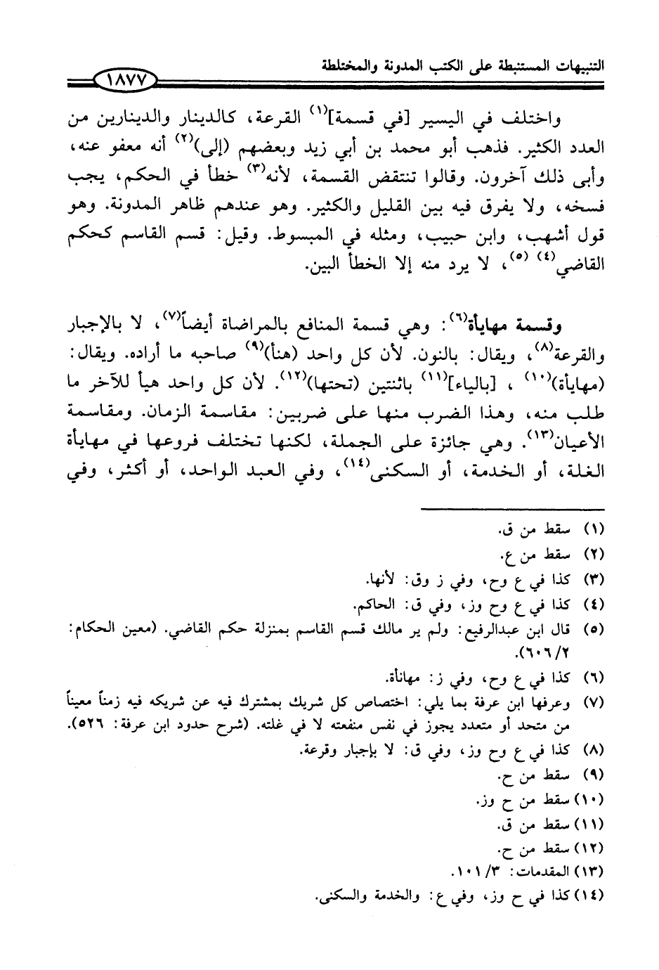 (¬7) وعرفها ابن عرفة بما يلي: اختصاص كل شريك بمشترك فيه عن شريكه فيه زمناً معيناً من متحد أو متعدد يجوز في نفس منفعته لا في غلته. (شرح حدود ابن عرفة: 526).