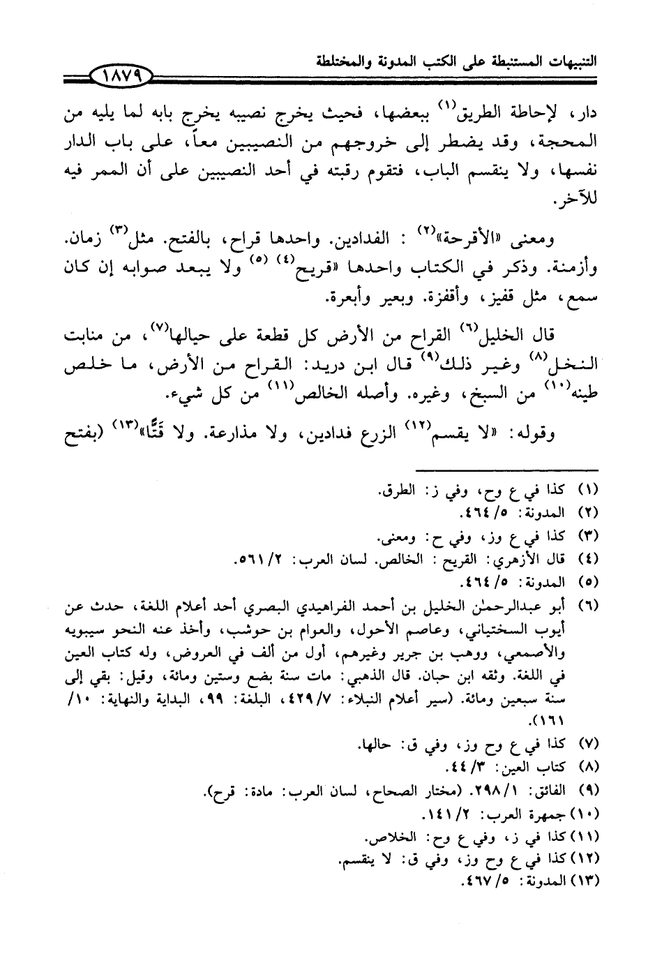 ومعنى "الأقرحة" (¬2): الفدادين. واحدها قراح، بالفتح. مثل (¬3) زمان. وأزمنة. وذكر في الكتاب واحدها "قريح (¬4) (¬5) ولا يبعد صوابه إن كان سمع، مثل قفيز، وأقفزة. وبعير وأبعرة.