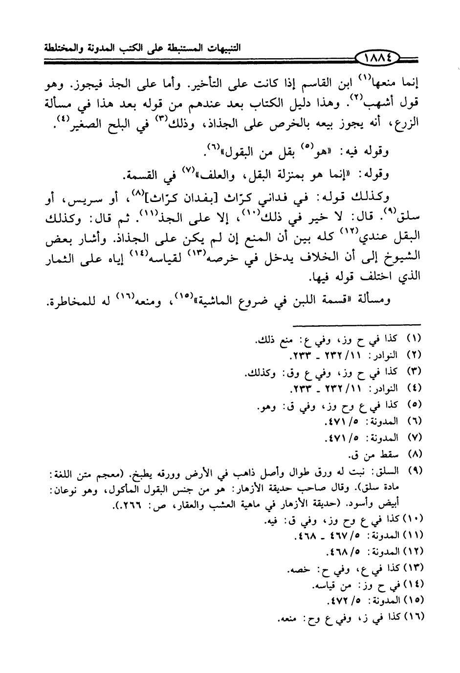 وكذلك قوله: في فداني كرّاث [بفدان كرّاث] (¬8)، أو سريس، أو سلق (¬9). قال: لا خير في ذلك (¬10)، إلا على الجذ (¬11). ثم قال: وكذلك البقل عندي (¬12) كله بين أن المنع إن لم يكن على الجذاذ. وأشار بعض الشيوخ إلى أن الخلاف يدخل في خرصه (¬13) لقياسه (¬14) إياه على الثمار الذي اختلف قوله فيها.