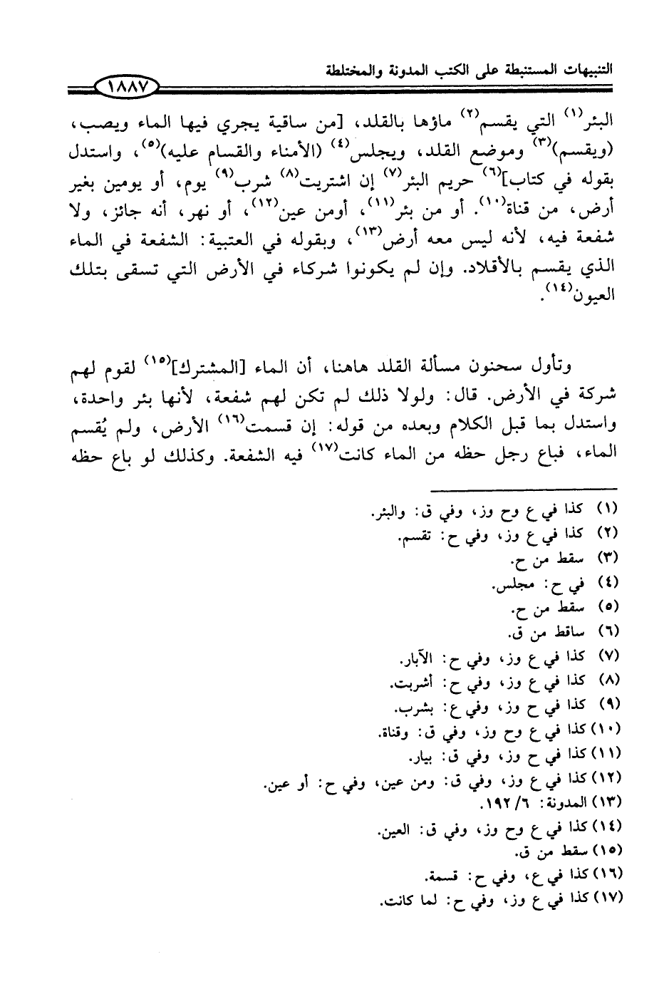 وتأول سحنون مسألة القلد ها هنا، أن الماء [المشترك] (¬15) لقوم لهم شركة في الأرض. قال: ولولا ذلك لم تكن لهم شفعة، لأنها بئر واحدة، واستدل بما قبل الكلام وبعده من قوله: إن قسمت (¬16) الأرض، ولم يُقسم الماء، فباع رجل حظه من الماء كانت (¬17) فيه الشفعة. وكذلك لو باع حظه