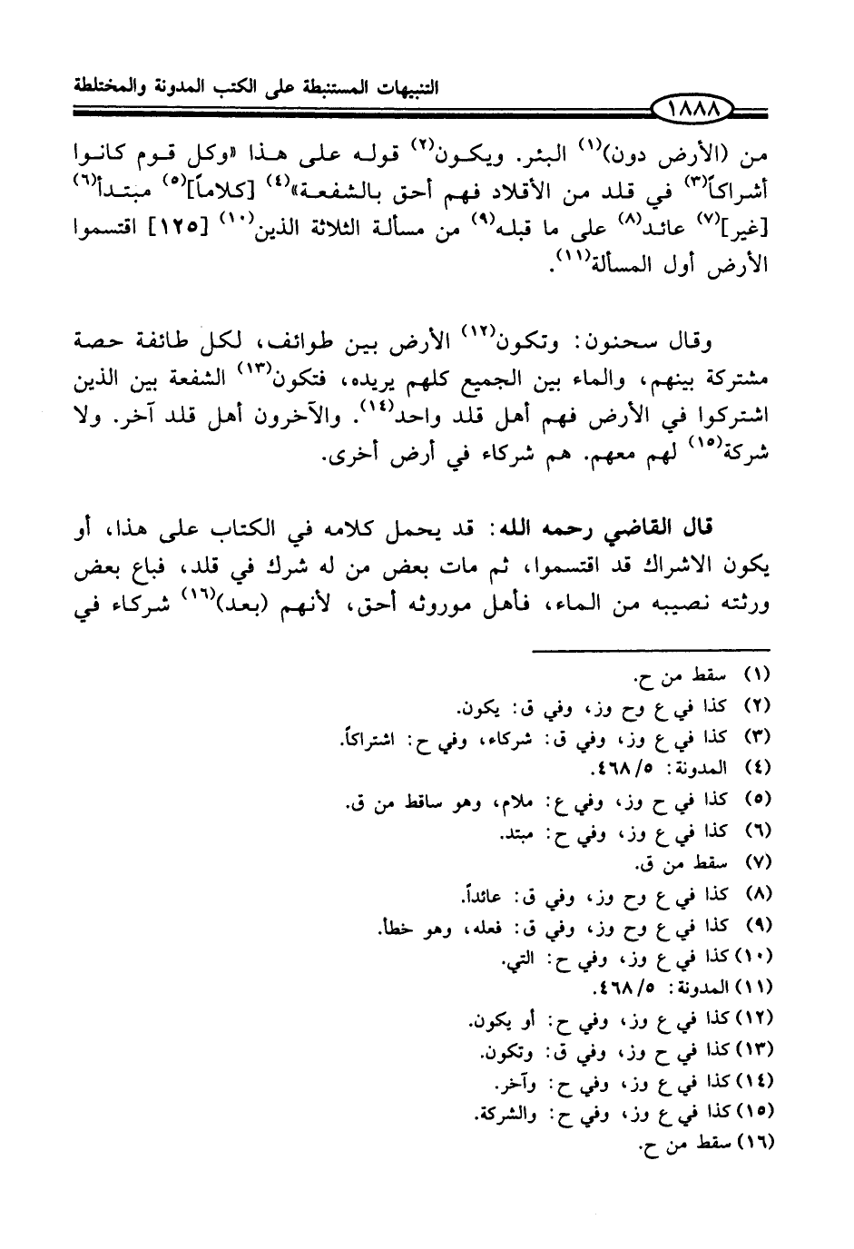 وقال سحنون: وتكون (¬12) الأرض بين طوائف، لكل طائفة حصة مشتركة بينهم، والماء بين الجميع كلهم يريده، فتكون (¬13) الشفعة بين الذين اشتركوا في الأرض فهم أهل قلد واحد (¬14). والآخرون أهل قلد آخر. ولا شركة (¬15) لهم معهم. هم شركاء في أرض أخرى.