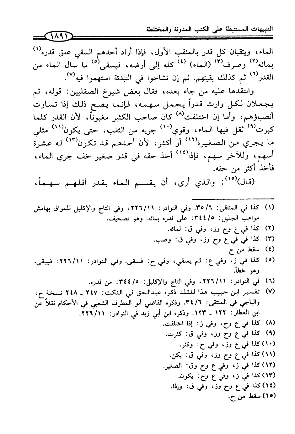 الماء، ويثقبان كل قدر بالمثقب الأول، فإذا أراد أحدهم السقي علق قدره (¬1) بمائه (¬2) وصرف (¬3) (الماء) (¬4) كله إلى أرضه، فيسقى (¬5) ما سال الماء من القدر (¬6) ثم كذلك بقيتهم. ثم إن تشاحوا في التبدئة استهموا فيه (¬7).