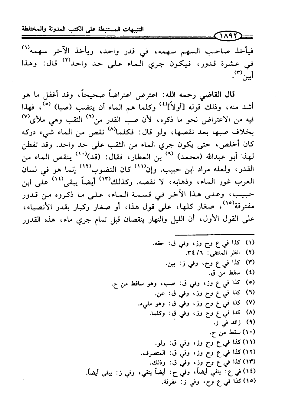 قال القاضي رحمه الله: اعترض اعتراضاً صحيحاً، وقد أغفل ما هو أشد منه، وذلك قوله [أولاً] (¬4) وكلما هم الماء أن ينضب (صبا) (¬5)، فهذا فيه من الاعتراض نحو ما ذكره، لأن صب القدر من (¬6) الثقب وهي ملأى (¬7) بخلاف صبها بعد نقصها، ولو قال: فكلما (¬8) نقص من الماء شيء دركه كان أخلص، حتى يكون جري الماء من الثقب على حد واحد. وقد تفطن لهذا أبو عبد الله (محمد) (¬9) بن العطار، فقال: (قد) (¬10) ينقص الماء من القدر، ولعله مراد ابن حبيب. وإن (¬11) كان النضوب (¬12) إنما هو في لسان العرب غور الماء، وذهابه، لا نقصه. وكذلك (¬13) أيضاً يبقى (¬14) على ابن حبيب، وعلى هذا الآخر في قسمة الماء، على ما ذكروه من قدور مفترقة (¬15)، صغار كلها، على قول هذا، أو صغار وكبار بقدر الأنصباء، على القول الأول، أن الليل والنهار ينقصان قبل تمام جري ماء، هذه القدور