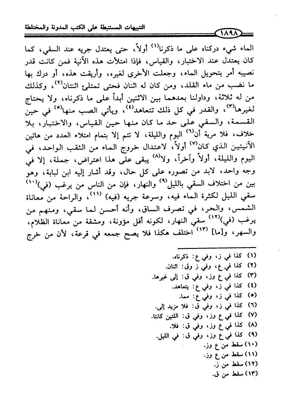 الماء شيء دركناه على ما ذكرنا (¬1) أولاً، حتى يعتدل جريه عند السقي، كما كان يعتدل عند الاختبار، والقياس، فإذا امتلأت هذه الآنية فمن كانت قدر نصيبه أمر بتحويل الماء، وجعلت الأخرى لغيره، وأريقت هذه، أو درك بها ما نضب من ماء القلد، ومن كان له اثنان فحتى تمتلئ اثنتان (¬2)، وكذلك من له ثلاثة، وداولنا بعدهما بين الاثنين أبداً على ما ذكرناه، ولا يحتاج لغيرها (¬3)، والقدر في كل ذلك تتعاهد (¬4)، ويأتي الصب منها (¬5) في حين القسمة، والسقي على حد ما كان منها حين القياس، والاختبار، بلا خلاف، فلا مرية أن (¬6) اليوم والليلة، لا تتم إلا بتمام امتلاء العدد من هاتين الآنيتين الذي كان (¬7) أولاً، لاعتدال خروج الماء من الثقب الواحد، في اليوم والليلة، أولاً وآخراً، ولا (¬8) يبقى على هذا اعتراض، جملة، إلا في وجه واحد، لا بد من تصوره على كل حال، وقد أشار إليه ابن لبابة، وهو بين من اختلاف السقي بالليل (¬9) والنهار، فإن من الناس من يرغب (في) (¬10) سقي الليل لكثرة الماء فيه، وسرعة جريه (فيه) (¬11)، والراحة من معاناة الشمس، والحر، في تصرف الساق، وأنه أحسن لما سقي، ومنهم من يرغب (في) (¬12) سقي النهار، لكونه أقل مؤونة، ومشقة من معاناة الظلام، والسهر، و [ما] (¬13) اختلف هكذا فلا يصح جمعه في قرعة، لأن من خرج