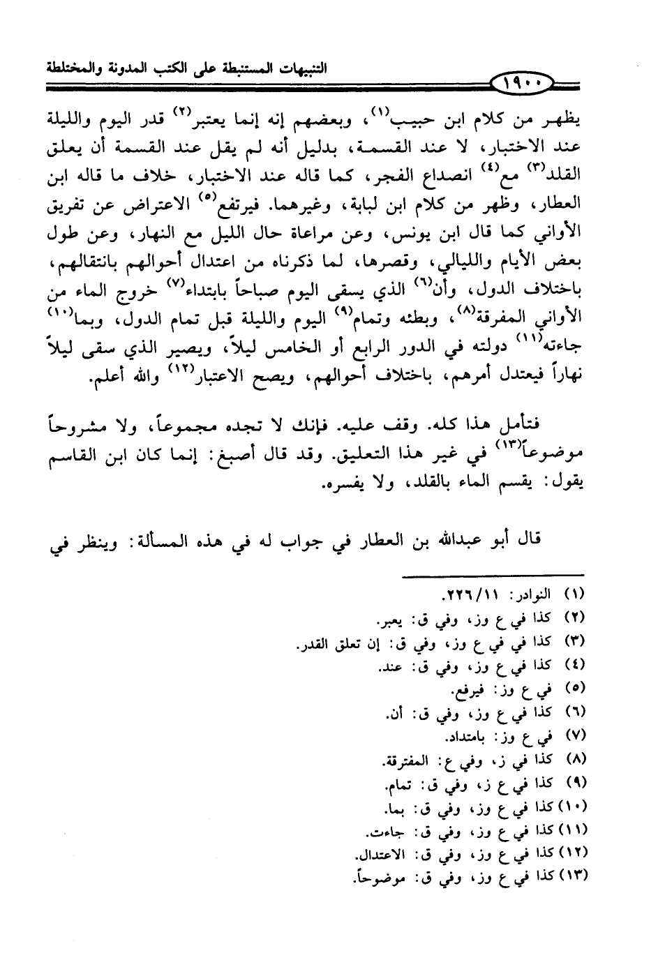 يظهر من كلام ابن حبيب (¬1)، وبعضهم إنه إنما يعتبر (¬2) قدر اليوم والليلة عند الاختبار، لا عند القسمة، بدليل أنه لم يقل عند القسمة أن يعلق القلد (¬3) مع (¬4) انصداع الفجر، كما قاله عند الاختبار، خلاف ما قاله ابن العطار، وظهر من كلام ابن لبابة، وغيرهما. فيرتفع (¬5) الاعتراض عن تفريق الأواني كما قال ابن يونس، وعن مراعاة حال الليل مع النهار، وعن طول بعض الأيام والليالي، وقصرها، لما ذكرناه من اعتدال أحوالهم بانتقالهم، باختلاف الدول، وأن (¬6) الذي يسقى اليوم صباحاً بابتداء (¬7) خروج الماء من الأواني المفرقة (¬8)، وبطئه وتمام (¬9) اليوم والليلة قبل تمام الدول، وبما (¬10) جاءته (¬11) دولته في الدور الرابع أو الخامس ليلاً، ويصير الذي سقى ليلاً نهاراً فيعتدل أمرهم، باختلاف أحوالهم، ويصح الاعتبار (¬12) والله أعلم.