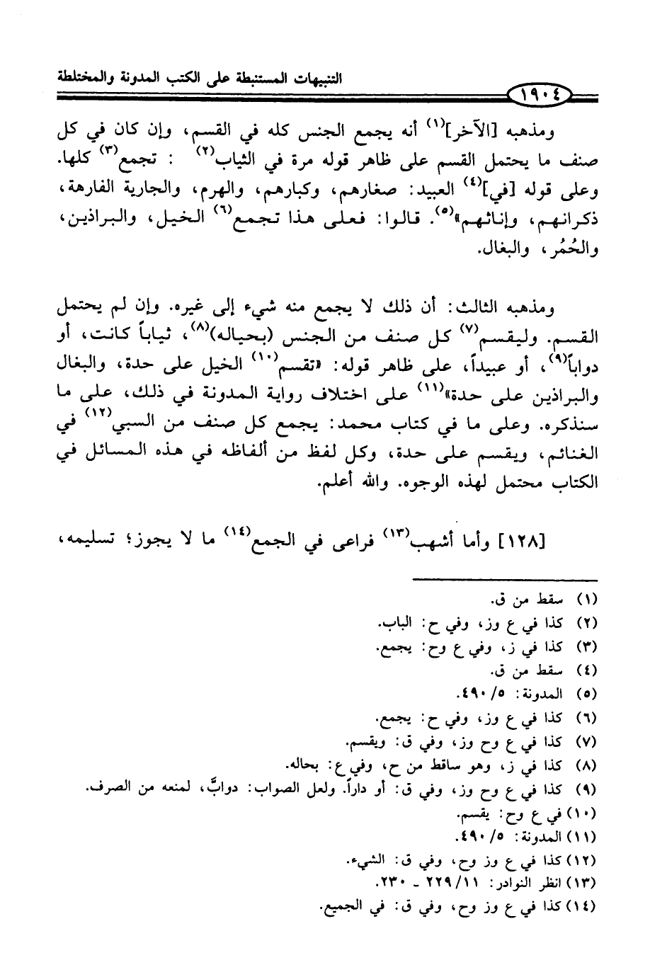 ومذهبه [الآخر] (¬1) أنه يجمع الجنس كله في القسم، وإن كان في كل صنف ما يحتمل القسم على ظاهر قوله مرة في الثياب (¬2): تجمع (¬3) كلها. وعلى قوله [في] (¬4) العبيد: صغارهم، وكبارهم، والهرم، والجاربة الفارهة، ذكرانهم، وإناثهم" (¬5). قالوا: فعلى هذا تجمع (¬6) الخيل، والبراذين، والحُمُر، والبغال.