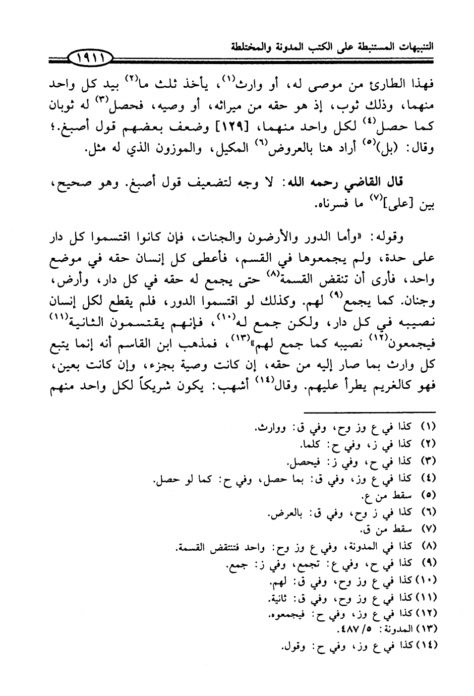 وقوله: "وأما الدور والأرضون والجنات، فإن كانوا اقتسموا كل دار على حدة، ولم يجمعوها في القسم، فأعطى كل إنسان حقه في موضع واحد، فأرى أن تنقض القسمة (¬8) حتى يجمع له حقه في كل دار، وأرض، وجنان. كما يجمع (¬9) لهم. وكذلك لو اقتسموا الدور، فلم يقطع لكل إنسان نصيبه في كل دار، ولكن جمع له (¬10)، فإنهم يقتسمون الثانية (¬11) فيجمعون (¬12) نصيبه كما جمع لهم" (¬13)، فمذهب ابن القاسم أنه إنما يتبع كل وارث بما صار إليه من حقه، إن كانت وصية بجزء، وإن كانت بعين، فهو كالغريم يطرأ عليهم. وقال (¬14) أشهب: يكون شريكاً لكل واحد منهم