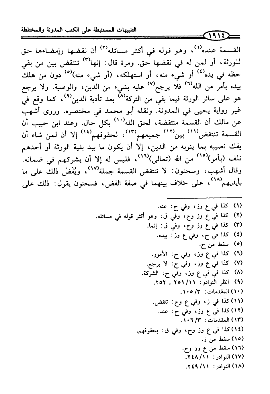 القسمة عنده (¬1)، وهو قوله في أكثر مسائله (¬2) أن نقضها وإمضاءها حق للورثة، أو لمن له في نقضها حق. ومرة قال: إنها (¬3) تنتقض بين من بقي حظه في يده (¬4) أو شيء منه، أو استهلكه، (أو شيء منه) (¬5) دون من هلك بيده بأمر من الله (¬6) فلا يرجع (¬7) عليه بشيء من الدين، والوصية. ولا يرجع هو على سائر الورثة فيما بقي من التركة (¬8) بعد تأدية الدين (¬9)، كما وقع في غير رواية يحيى في المدونة. ونقله أبو محمد في مختصره. وروى أشهب عن مالك أن القسمة منتقضة، لحق الله (¬10) بكل حال. وعند ابن حبيب أن القسمة تنتقض (¬11) بين (¬12) جميعهم (¬13)، لحقوقهم (¬14) إلا أن لمن شاء أن يفك نصيبه بما ينوبه من الدين، إلا أن يكون ما بيد بقية الورثة أو أحدهم تلف (بأمر) (¬15) من الله (تعالى) (¬16)، فليس له إلا أن يشركهم في ضمانه. وقال أشهب، وسحنون: لا تنتقض القسمة جملة (¬17)، ويُفَضّ ذلك على ما بأيديهم (¬18)، على خلاف بينهما في صفة الفض، فسحنون يقول: ذلك على