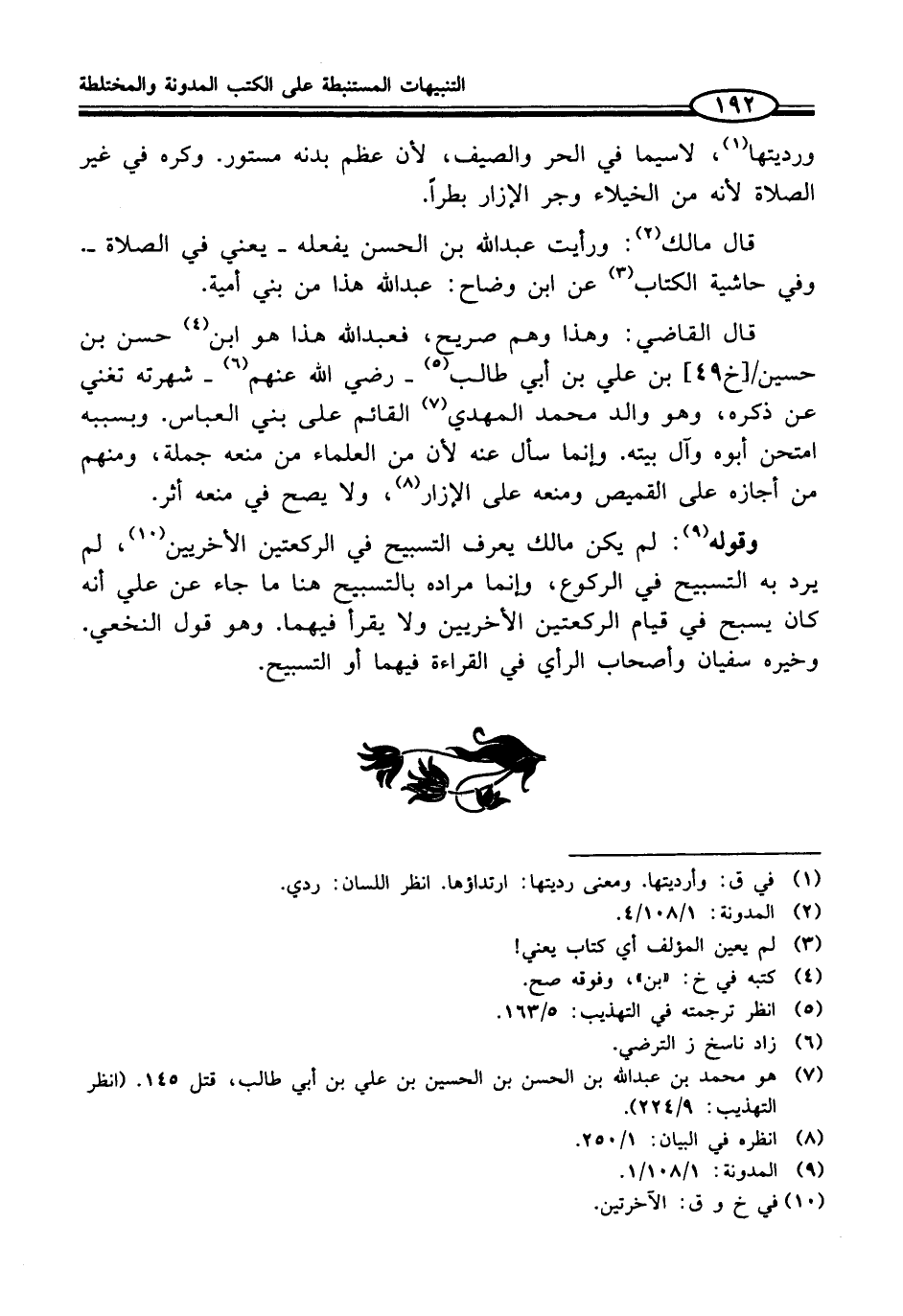 قال القاضي: وهذا وهم صريح، فعبد الله هذا هو ابن (¬4) حسن بن حسين/ [خ 49] بن علي بن أبي طالب (¬5) - رضي الله عنهم (¬6) - شهرته تغني عن ذكره، وهو والد محمَّد المهدي (¬7) القائم علي بني العباس. وبسببه امتحن أبوه وآل بيته. وإنما سأل عنه لأن من العلماء من منعه جملة، ومنهم من أجازه على القميص ومنعه على الإزار (¬8)، ولا يصح في منعه أثر.