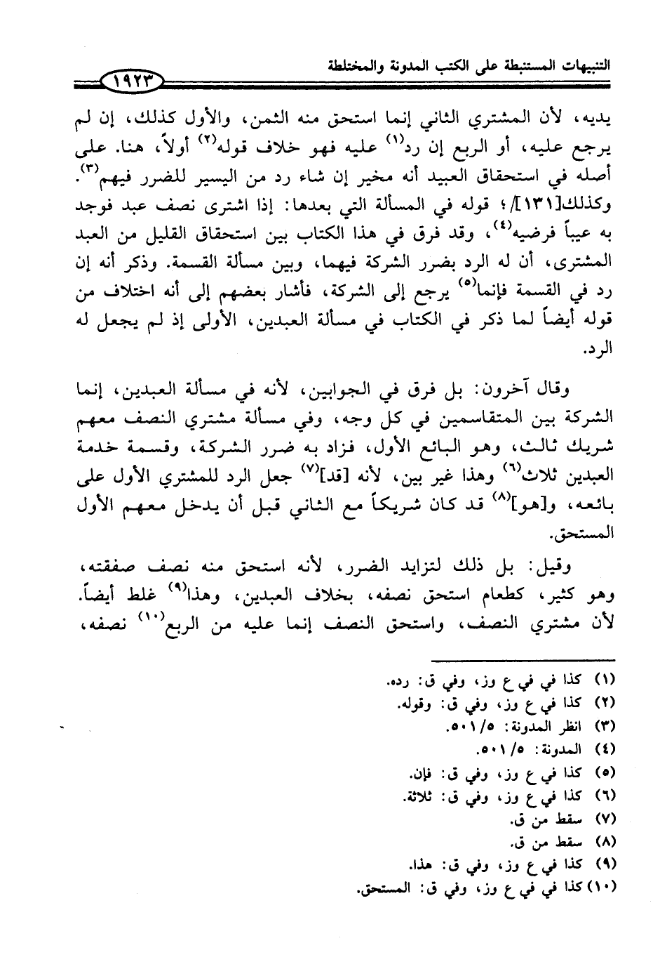 يديه، لأن المشتري الثاني إنما استحق منه الثمن، والأول كذلك، إن لم يرجع عليه، أو الربع إن رد (¬1) عليه فهو خلاف قوله (¬2) أولاً، هنا. على أصله في استحقاق العبيد أنه مخير إن شاء رد من اليسير للضرر فيهم (¬3). وكذلك [131] /؛ قوله في المسألة التي بعدها: إذا اشترى نصف عبد فوجد به عيباً فرضيه (¬4)، وقد فرق في هذا الكتاب بين استحقاق القليل من العبد المشترى، أن له الرد بضرر الشركة فيهما، وبين مسألة القسمة. وذكر أنه إن رد في القسمة فإنما (¬5) يرجع إلى الشركة، فأشار بعضهم إلى أنه اختلاف من قوله أيضاً لما ذكر في الكتاب في مسألة العبدين، الأولى إذ لم يجعل له الرد.