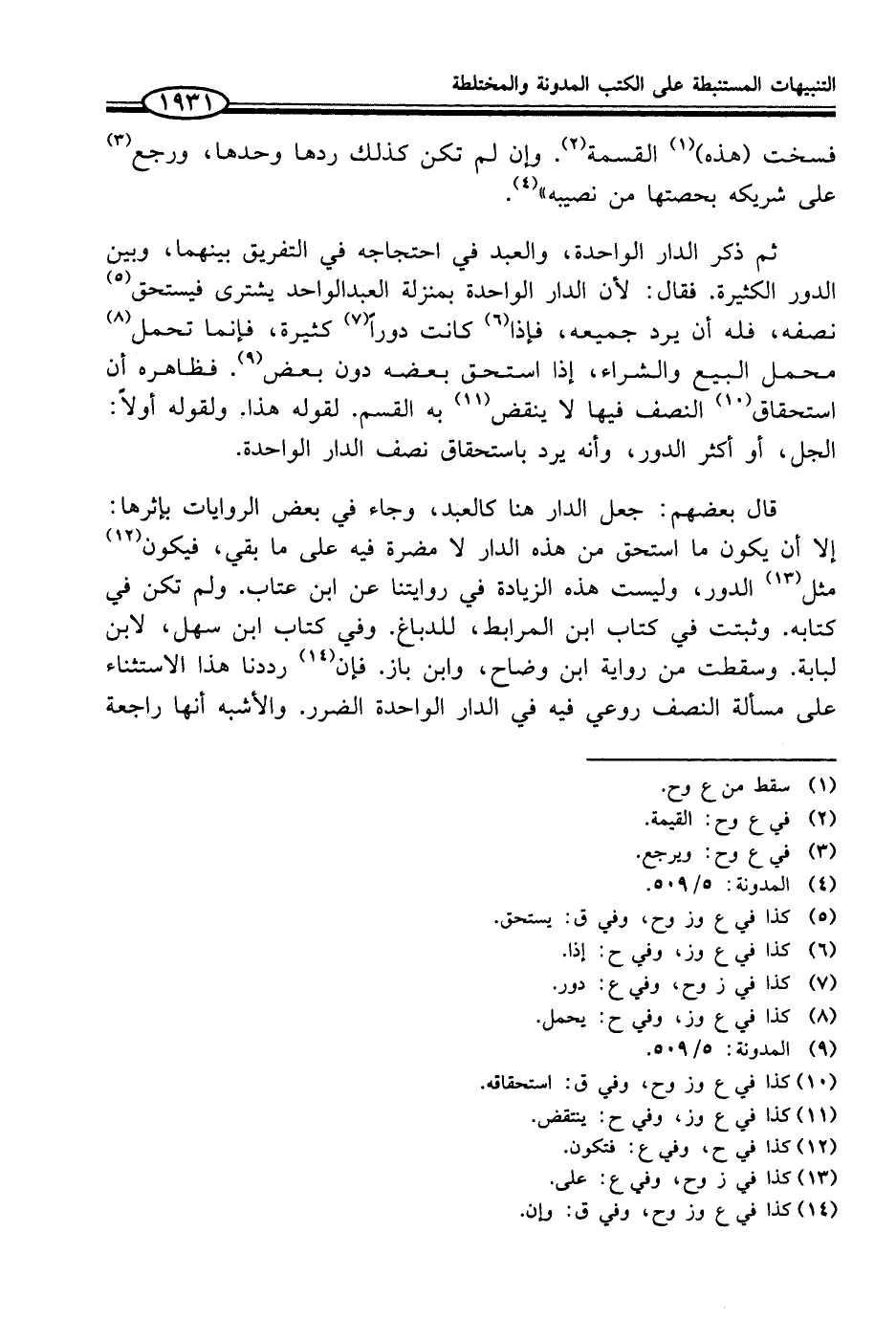 قال بعضهم: جعل الدار هنا كالعبد، وجاء في بعض الروايات بإثرها: إلا أن يكون ما استحق من هذه الدار لا مضرة فيه على ما بقي، فيكون (¬12) مثل (¬13) الدور، وليست هذه الزيادة في روايتنا عن ابن عتاب. ولم تكن في كتابه. وثبتت في كتاب ابن المرابط، للدباغ. وفي كتاب ابن سهل، لابن لبابة. وسقطت من رواية ابن وضاح، وابن باز. فإن (¬14) رددنا هذا الاستثناء على مسألة النصف روعي فيه في الدار الواحدة الضرر. والأشبه أنها راجعة