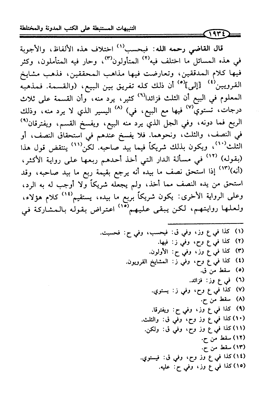 قال القاضي رحمه الله: فبحسب (¬1) اختلاف هذه الألفاظ، والأجوبة في هذه المسائل ما اختلف فيه (¬2) المتأولون (¬3)، وحار فيه المتأملون، وكثر فيها كلام المدققين، وتعارضت فيها مذاهب المحققين، فذهب مشايخ القرويين (¬4) [إلى] (¬5) أن ذلك كله تفريق بين البيع، (والقسمة. فمذهبه المعلوم في البيع أن الثلث فزائدا (¬6) كثير، يرد منه، وأن القسمة على ثلاث درجات، تستوي (¬7) فيها مع البيع، في) (¬8) اليسير الذي لا يرد منه، وذلك الربع فما دونه، وفي الجل الذي يرد منه البيع، ويفسخ القسم، ويفترقان (¬9) في النصف، والثلث، ونحوهما. فلا يفسخ عندهم في استحقاق النصف، أو الثلث (¬10)، ويكون بذلك شريكاً فيما بيد صاحبه. لكن (¬11) ينتقض قول هذا (بقوله) (¬12) في مسألة الدار التي أخذ أحدهم ربعها على رواية الأكثر، (أنه) (¬13) إذا استحق نصف ما بيده أنه يرجع بقيمة ربع ما بيد صاحبه، وقد استحق من يده النصف مما أخذ، ولم يجعله شريكاً ولا أوجب له به الرد، وعلى الرواية الأخرى: يكون شريكاً بربع ما بيده، يستقيم (¬14) كلام هؤلاء، ولعلها روايتهم، لكن يبقى عليهم (¬15) اعتراض بقوله بالمشاركة في