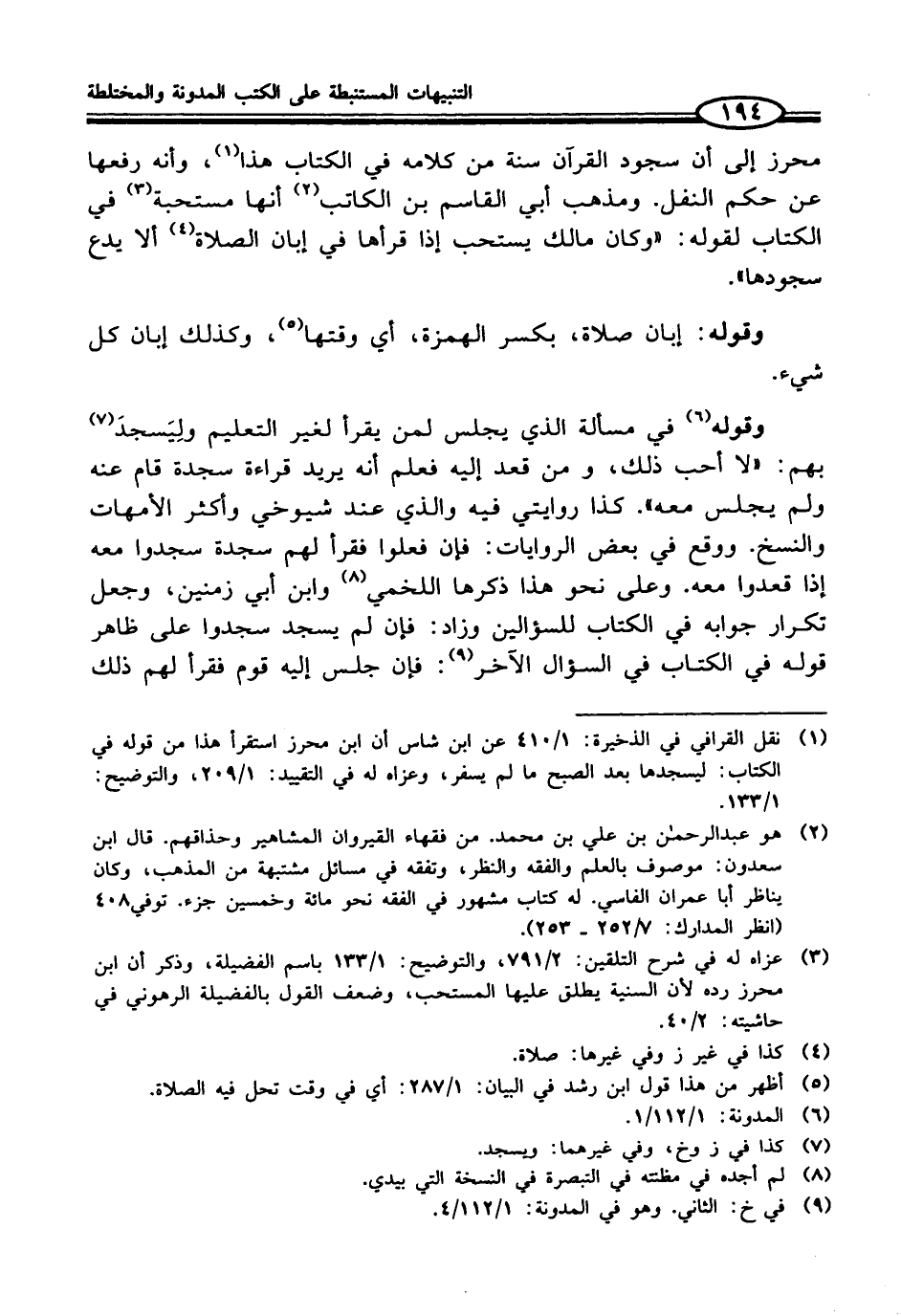 (¬1) نقل القرافي في الذخيرة: 1/ 410 عن ابن شاس ان ابن محرز استقرأ هذا من قوله في الكتاب: ليسجدها بعد الصبح ما لم يسفر، وعزاه له في التقييد: 1/ 209، والتوضيح: 1/ 133.