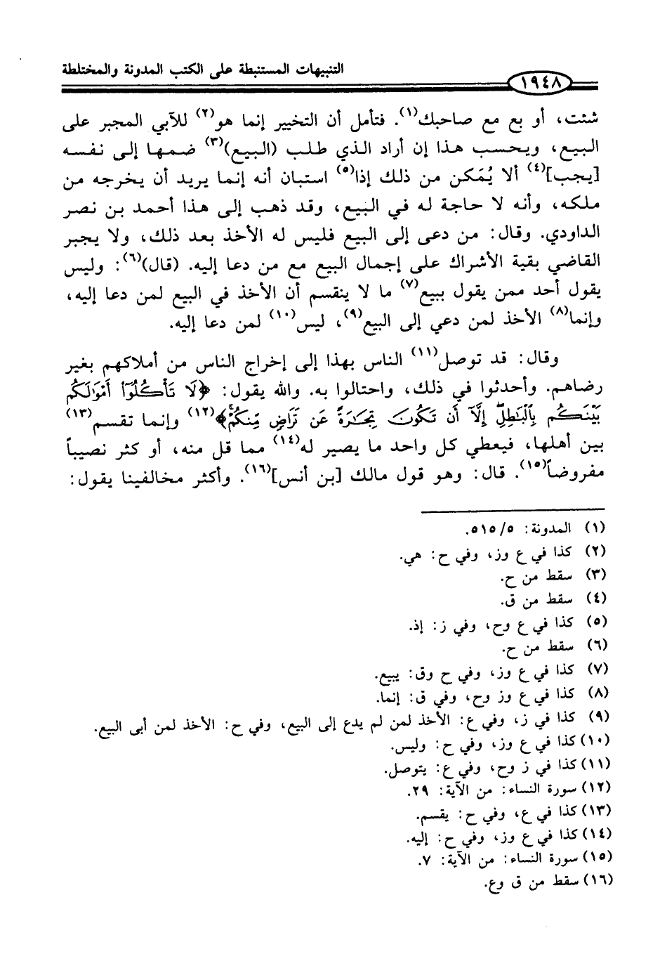 وقال: قد توصل (¬11) الناس بهذا إلى إخراج الناس من أملاكهم بغير رضاهم. وأحدثوا في ذلك، واحتالوا به. والله يقول: {لَا تَأْكُلُوا أَمْوَالَكُمْ بَيْنَكُمْ بِالْبَاطِلِ إلا أَنْ تَكُونَ تِجَارَةً عَنْ تَرَاضٍ مِنْكُمْ} (¬12) وإنما تقسم (¬13) بين أهلها، فيعطي كل واحد ما يصير له (¬14) مما قل منه، أو أكثر نصيباً مفروضاً (¬15). قال: وهو قول مالك [بن أنس] (¬16). وأكثر مخالفينا يقول: