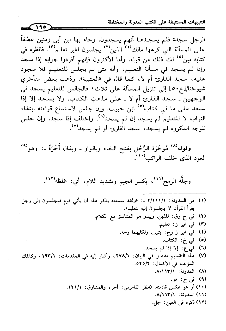 الرجل سجدة فلم يسجدها أنهم يسجدون. وجاء بها ابن أبي زمنين عطفاً على المسألة التي كرهها مالك (¬1) الذين (¬2) يجلسون لغير تعلم (¬3). فانظره في كتابه يبن (¬4) لك ذلك من قوله. وأما الأكثرون فإنهم أفردوا جوابه إذا سجد وإذا لم يسجد في مسألة التعليم، وأنه متى لم يجلس للتعليم فلا سجود عليه، سجد القارئ أم لا، كما قال في "العتبية". وذهب بعض متأخري شيوخنا/ [خ 50] إلى تنزيل المسألة على ثلاث؛ فالجالس للتعليم يسجد في الوجهين - سجد القارئ أم لا - على مذهب الكتاب. ولا يسجد إلا إذا سجد على ما في كتاب (¬5) ابن حبيب. وإن جلس لاستماع قراءته ابتغاء الثواب لا للتعليم لم يسجد إن لم يسجد (¬6). واختلف إذا سجد. وإن جلس للوجه المكروه لم يسجد، سجد القارئ أو لم يسجد (¬7).