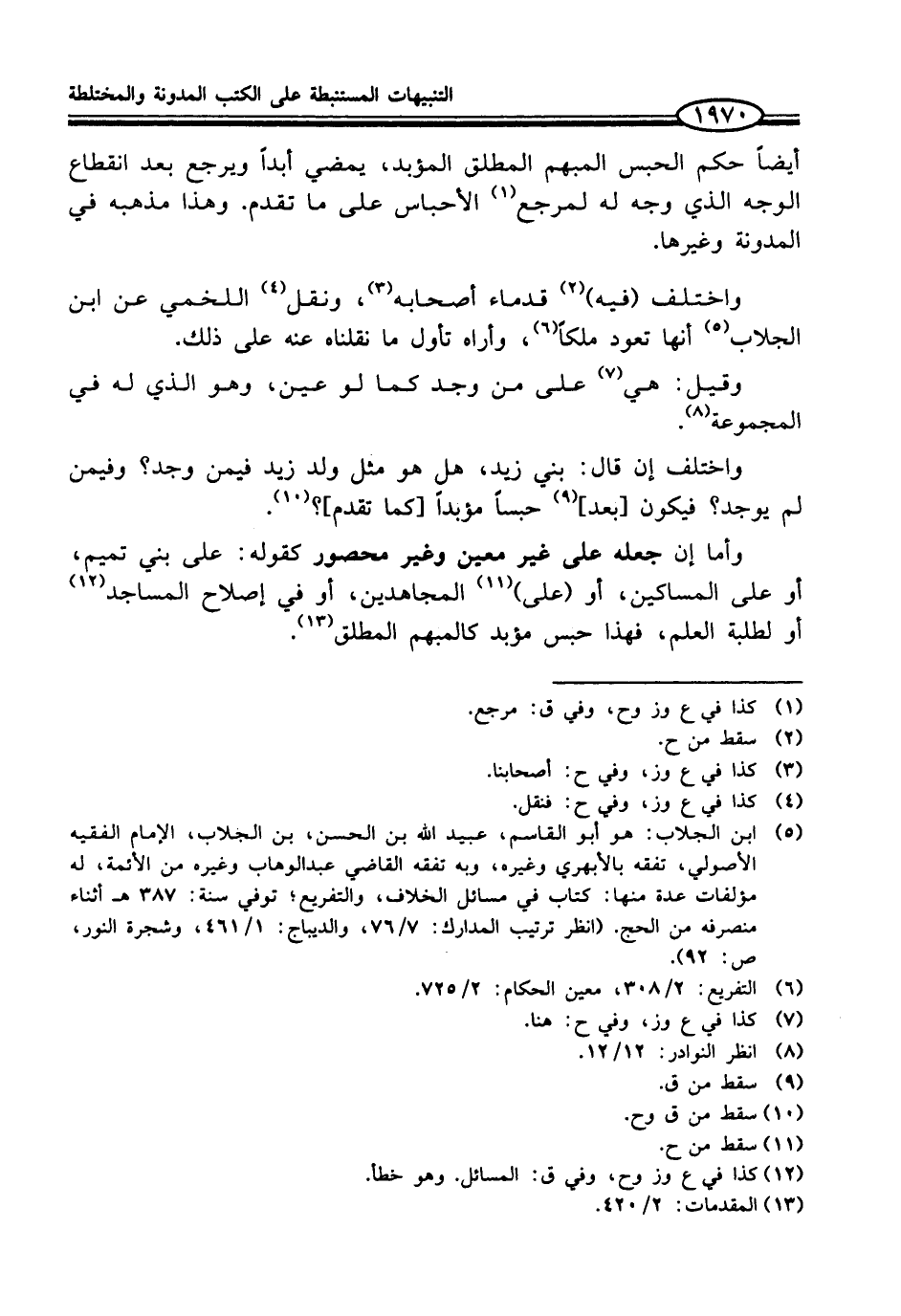 (¬5) ابن الجلاب: هو أبو القاسم، عبيد الله بن الحسن، بن الجلاب، الإمام الفقيه الأصولي، تفقه بالأبهري وغيره، وبه تفقه القاضي عبد الوهاب وغيره من الأئمة، له مؤلفات عدة منها: كتاب في مسائل الخلاف، والتفريع؛ توفي سنة: 387 هـ أثناء منصرفه من الحج. (انظر ترتيب المدارك: 7/ 76، والديباج: 1/ 461، وشجرة النور، ص: 92).