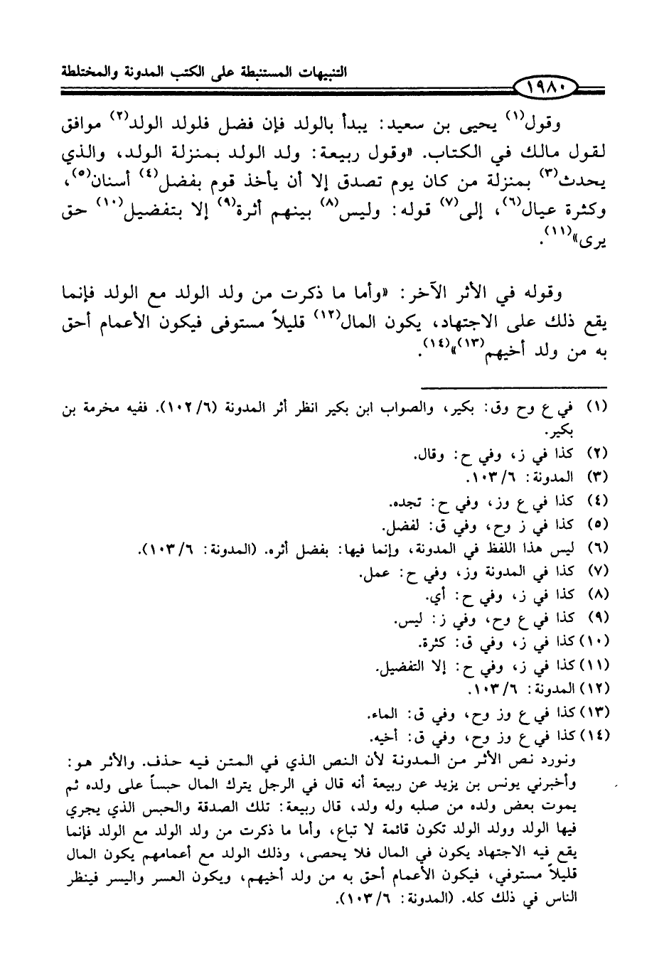 ونورد نص الأثر من المدونة لأن النص الذي في المتن فيه حذف. والأثر هو: وأخبرني يونس بن يزيد عن ربيعة أنه قال في الرجل يترك المال حبساً على ولده ثم يموت بعض ولده من صلبه وله ولد، قال ربيعة: تلك الصدقة والحبس الذي يجري فيها الولد وولد الولد تكون قائمة لا تباع، وأما ما ذكرت من ولد الولد مع الولد فإنما يقع فيه الاجتهاد يكون في المال فلا يحصى، وذلك الولد مع أعمامهم يكون المال قليلاً مستوفي، فيكون الأعمام أحق به من ولد أخيهم، ويكون العسر واليسر فينظر الناس في ذلك كله. (المدونة: 6/ 103).