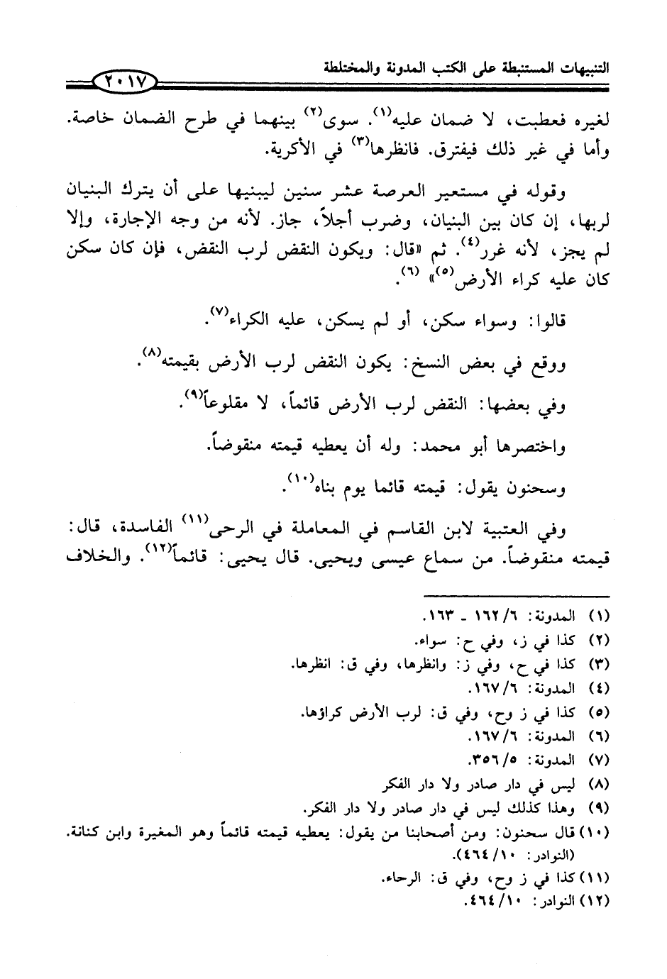 (¬10) قال سحنون: ومن أصحابنا من يقول: يعطيه قيمته قائماً وهو المغيرة وابن كنانة. (النوادر: 10/ 464).