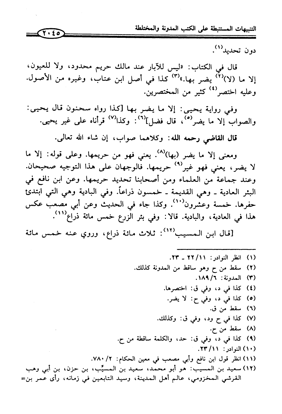 ومعنى إلا ما يضر (بها) (¬8). يعني فهو من حريمها. وعلى قوله: إلا ما لا يضر، يعني فهو غير (¬9) حريمها. فالوجهان على هذا التوجيه صحيحان. وعند جماعة من العلماء ومن أصحابنا تحديد حريمها. وعن ابن نافع في البئر العادية - وهي القديمة - خمسون ذراعاً. وفي البادية وهي التي ابتدئ حفرها. خمسة وعشرون (¬10). وكذا جاء في الحديث وعن أبي مصعب عكس هذا في العادية، والبادية. قالا: وفي بئر الزرع خمس مائة ذراع (¬11).