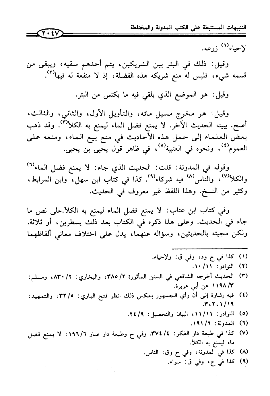وفي كتاب ابن عتاب: لا يمنع فضل الماء ليمنع به الكلأ. على نص ما جاء في الحديث. وعلى هذا ذكره في الكتاب بعد ذلك بسطرين، أو ثلاثة. ولكن مجيئه بالحديثين، وسؤاله عنهما، يدل على اختلاف معاني ألفاظهما