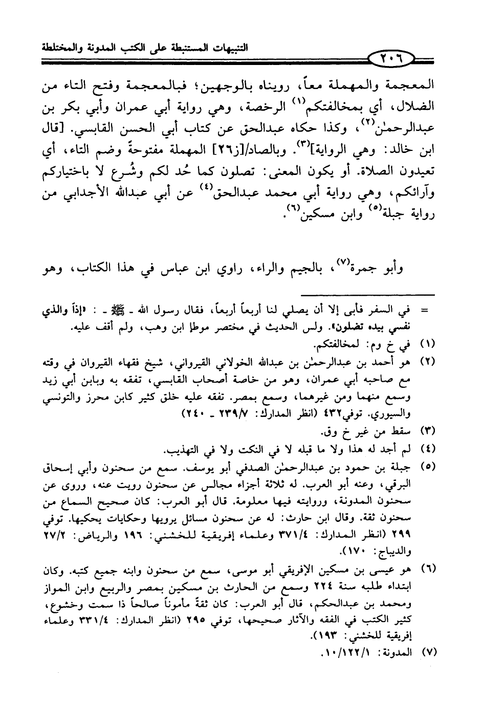 (¬5) جبلة بن حمود بن عبد الرحمن الصدفي أبو يوسف. سمع من سحنون وأبي إسحاق البرقي، وعنه أبو العرب. له ثلاثة أجزاء مجالس عن سحنون رويت عنه، وروى عن سحنون المدونة، وروايته فيها معلومة. قال أبو العرب: كان صحيح السماع من سحنون ثقة. وقال ابن حارث: له عن سحنون مسائل يرويها وحكايات يحكيها. توفي 299 (انظر المدارك: 4/ 371 وعلماء إفريقية للخشني: 196 والرياض: 2/ 27 والديباج: 170).