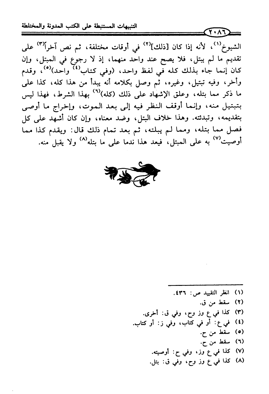 الشيوخ (¬1)، لأنه إذا كان [ذلك] (¬2) في أوقات مختلفة، ثم نص آخراً (¬3) على تقديم ما لم يبتل، فلا يصح عند واحد منهما، إذ لا رجوع في المبتل، وإن كان إنما جاء بذلك كله في لفظ واحد، (وفي كتاب (¬4) واحد) (¬5)، وقدم وأخر، وفيه تبتيل، وغيره، ثم وصل بكلامه أنه يبدأ من هذا كله، كذا على ما ذكر مما بتله، وعلق الإشهاد على ذلك (كله) (¬6) بهذا الشرط، فهذا ليس بتبتيل منه، وإنما أوقف النظر فيه إلى بعد الموت، وإخراج ما أوصى بتقديمه، وتبدئته. وهذا خلاف البتل، وضد معناه، وإن كان أشهد على كل فصل مما بتله، ومما لم يبلته، ثم بعد تمام ذلك قال: ويقدم كذا مما أوصيت (¬7) به على المبتل، فيعد هذا ندما على ما بتله (¬8) ولا يقبل منه.
