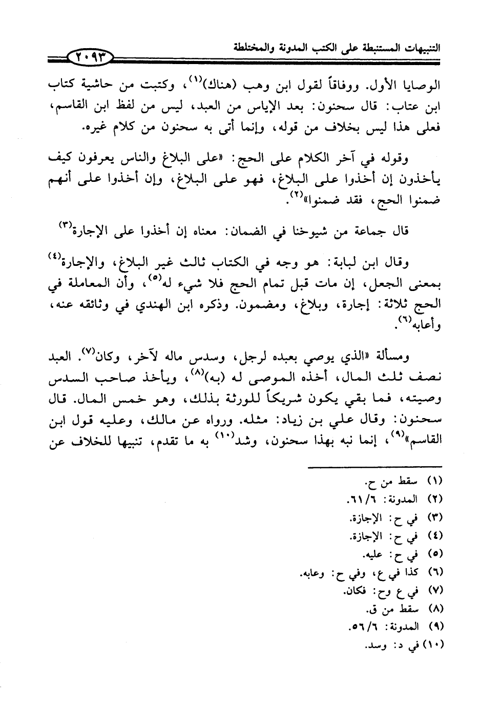 ومسألة "الذي يوصي بعبده لرجل، وسدس ماله لآخر، وكان (¬7). العبد نصف ثلث المال، أخذه الموصى له (به) (¬8)، ويأخذ صاحب السدس وصيته، فما بقي يكون شريكاً للورثة بذلك، وهو خمس المال. قال سحنون: وقال علي بن زياد: مثله. ورواه عن مالك، وعليه قول ابن القاسم" (¬9)، إنما نبه بهذا سحنون، وشد (¬10) به ما تقدم، تنبيها للخلاف عن