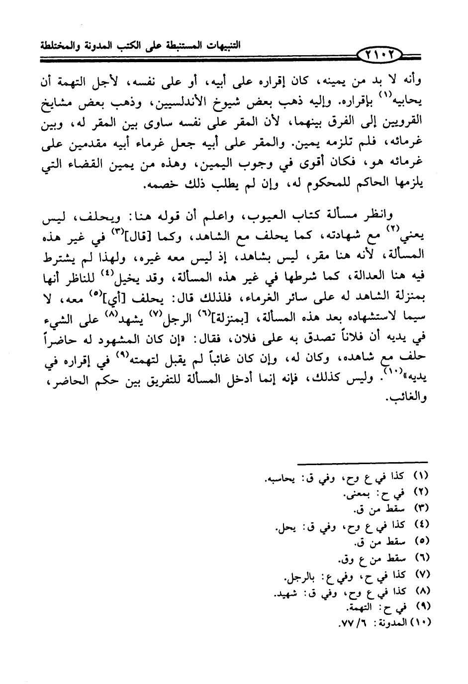 وانظر مسألة كتاب العيوب، واعلم أن قوله هنا: ويحلف، ليس يعني (¬2) مع شهادته، كما يحلف مع الشاهد، وكما [قال] (¬3) في غير هذه المسألة، لأنه هنا مقر، ليس بشاهد، إذ ليس معه غيره، ولهذا لم يشترط فيه هنا العدالة، كما شرطها في غير هذه المسألة، وقد يخيل (¬4) للناظر أنها بمنزلة الشاهد له على سائر الغرماء، فلذلك قال: يحلف [أي] (¬5) معه، لا سيما لاستشهاده بعد هذه المسألة، [بمنزلة] (¬6) الرجل (¬7) يشهد (¬8) على الشيء في يديه أن فلاناً تصدق به على فلان، فقال: "إن كان المشهود له حاضراً حلف مع شاهده، وكان له، وإن كان غائباً لم يقبل لتهمته (¬9) في إقراره في يديه" (¬10). وليس كذلك، فإنه إنما أدخل المسألة للتفريق بين حكم الحاضر، والغائب.