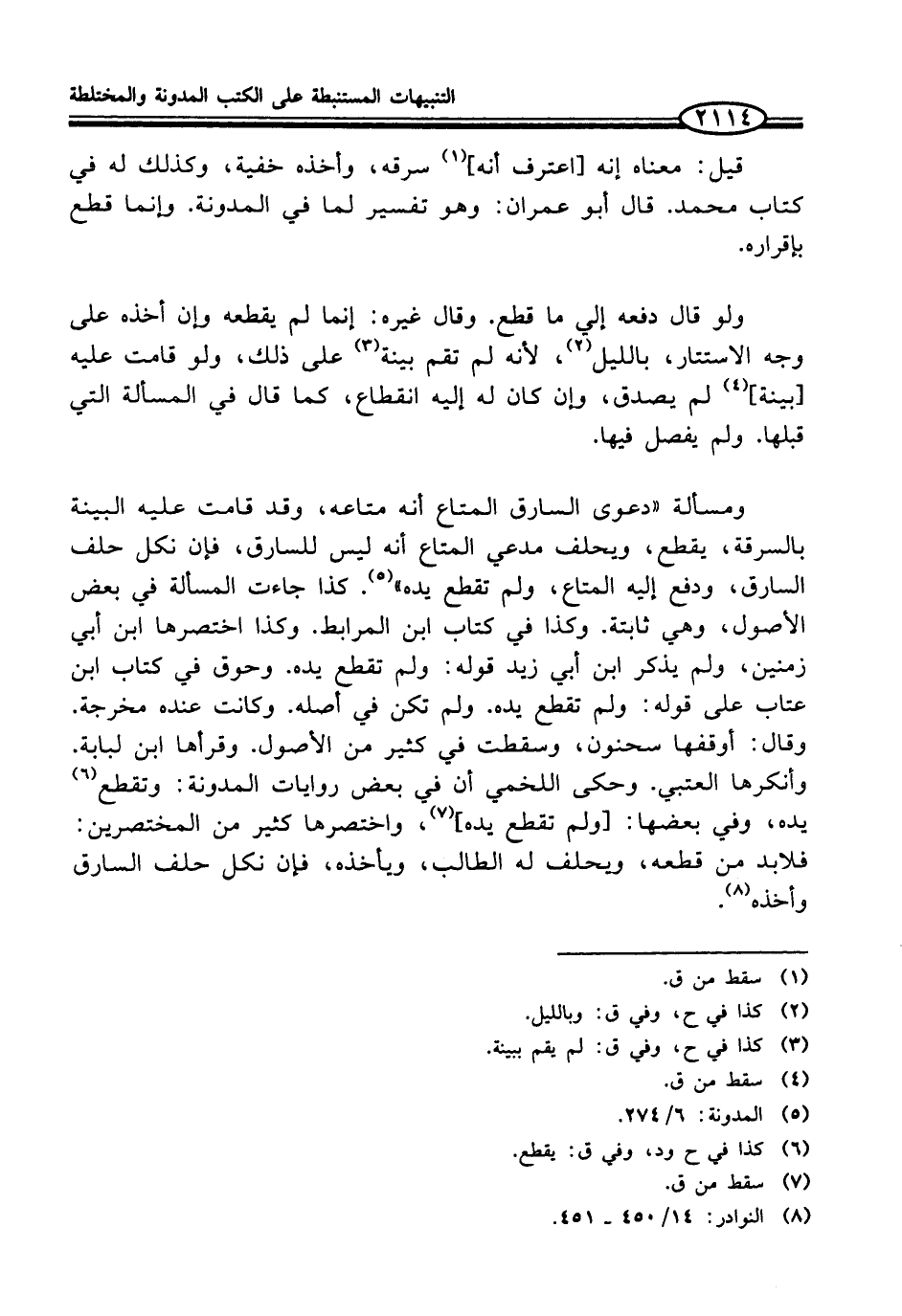 ومسألة "دعوى السارق المتاع أنه متاعه، وقد قامت عليه البينة بالسرقة، يقطع، ويحلف مدعي المتاع أنه ليس للسارق، فإن نكل حلف السارق، ودفع إليه المتاع، ولم تقطع يده" (¬5). كذا جاءت المسألة في بعض الأصول، وهي ثابتة. وكذا في كتاب ابن المرابط. وكذا اختصرها ابن أبي زمنين، ولم يذكر ابن أبي زيد قوله: ولم تقطع يده. وحوق في كتاب ابن عتاب على قوله: ولم تقطع يده. ولم تكن في أصله. وكانت عنده مخرجة. وقال: أوقفها سحنون، وسقطت في كثير من الأصول. وقرأها ابن لبابة. وأنكرها العتبي. وحكى اللخمي أن في بعض روايات المدونة: وتقطع (¬6) يده، وفي بعضها: [ولم تقطع يده] (¬7)، واختصرها كثير من المختصرين: فلا بد من قطعه، ويحلف له الطالب، ويأخذه، فإن نكل حلف السارق وأخذه (¬8).