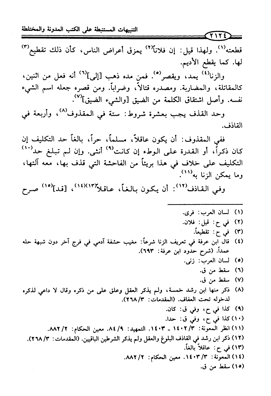 (¬12) ذكر ابن رشد في القاذف البلوغ والعقل ولم يذكر الشرطين الباقيين. (المقدمات: 3/ 268).