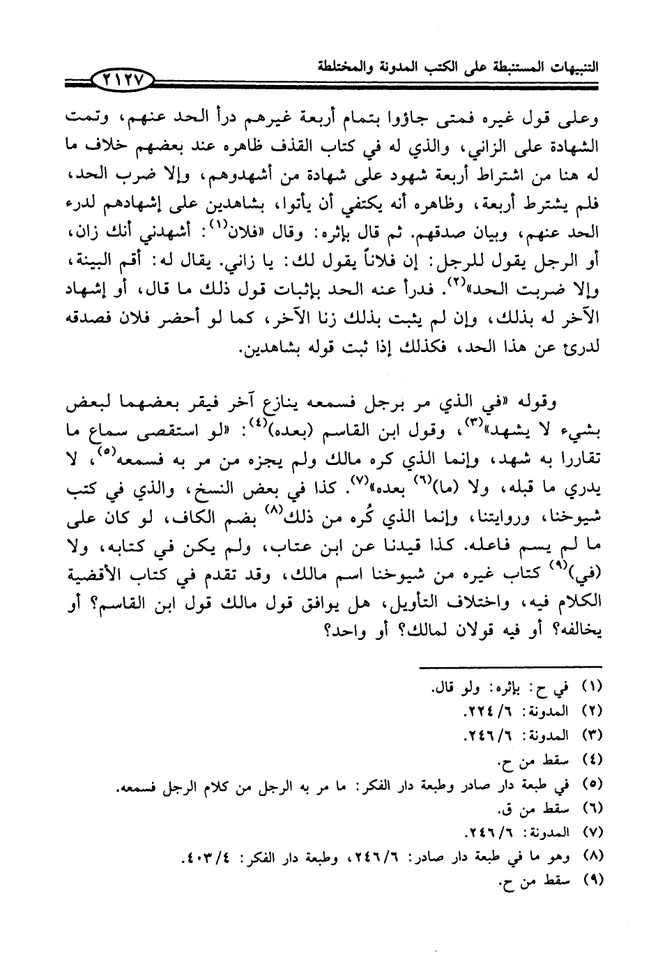 وعلى قول غيره فمتى جاؤوا بتمام أربعة غيرهم درأ الحد عنهم، وتمت الشهادة على الزاني، والذي له في كتاب القذف ظاهره عند بعضهم خلاف ما له هنا من اشتراط أربعة شهود على شهادة من أشهدوهم، وإلا ضرب الحد، فلم يشترط أربعة، وظاهره أنه يكتفي أن يأتوا، بشاهدين على إشهادهم لدرء الحد عنهم، وبيان صدقهم. ثم قال بإثره: وقال "فلان (¬1): أشهدني أنك زان، أو الرجل يقول للرجل: إن فلاناً يقول لك: يا زاني. يقال له: أقم البينة، وإلا ضربت الحد" (¬2). فدرأ عنه الحد بإثبات قول ذلك ما قال، أو إشهاد الآخر له بذلك، وإن لم يثبت بذلك زنا الآخر، كما لو أحضر فلان فصدقه لدرئ عن هذا الحد، فكذلك إذا ثبت قوله بشاهدين.