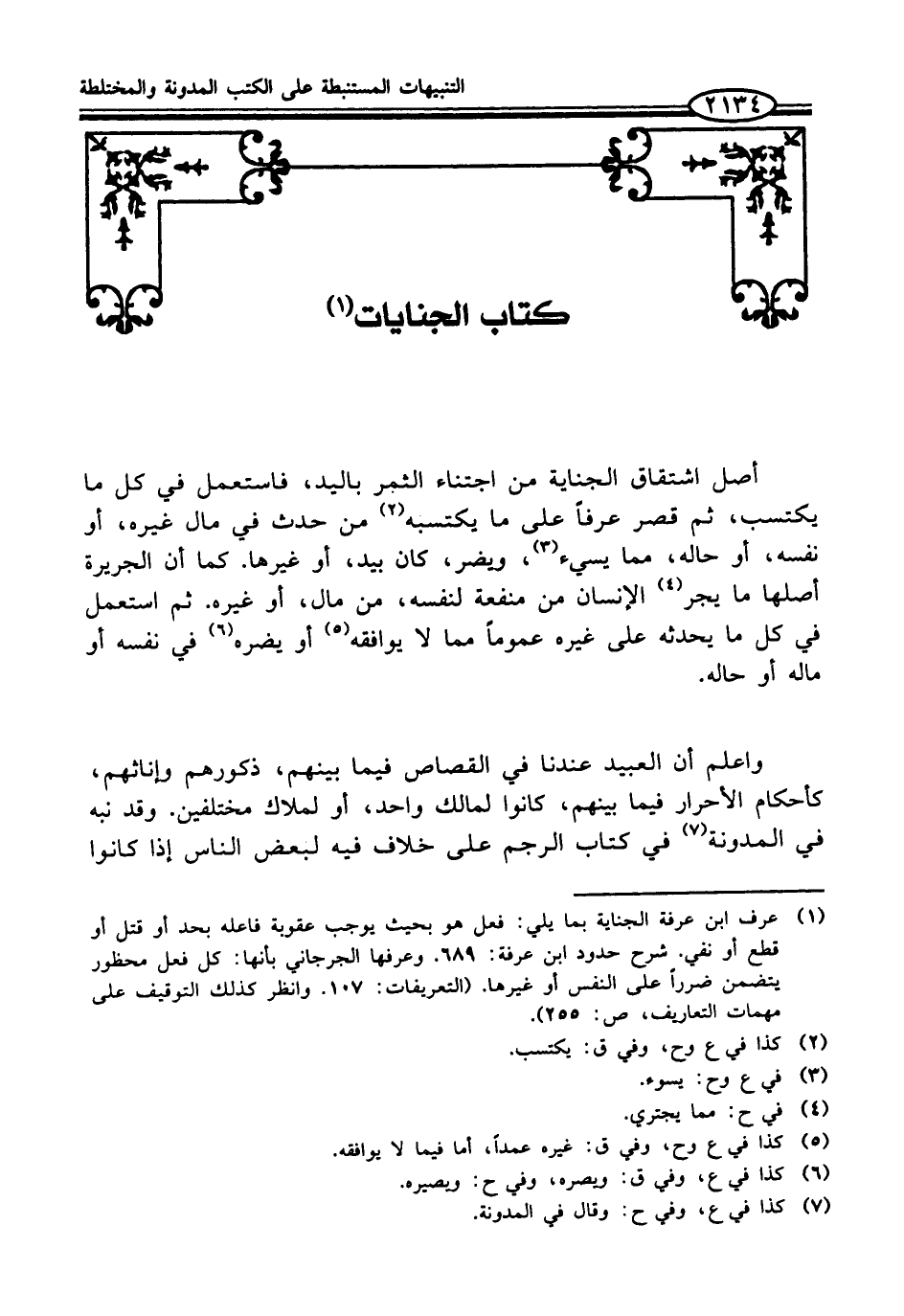 (¬1) عرف ابن عرفة الجناية بما يلي: فعل هو بحيث يوجب عقوبة فاعله بحد أو قتل أو قطع أو نفي. شرح حدود ابن عرفة: 689. وعرفها الجرجاني بأنها: كل فعل محظور يتضمن ضرراً على النفس أو غيرها. (التعريفات: 107. وانظر كذلك التوقيف على مهمات التعاريف، ص: 255).