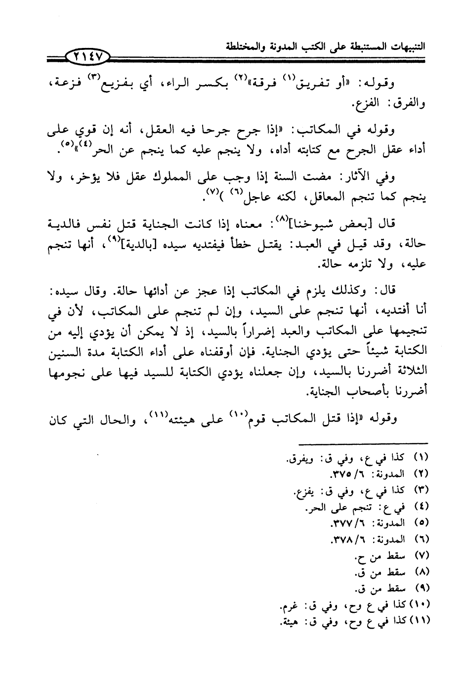 وقوله في المكاتب: "إذا جرح جرحا فيه العقل، أنه إن قوي على أداء عقل الجرح مع كتابته أداه، ولا ينجم عليه كما ينجم عن الحر (¬4) " (¬5).