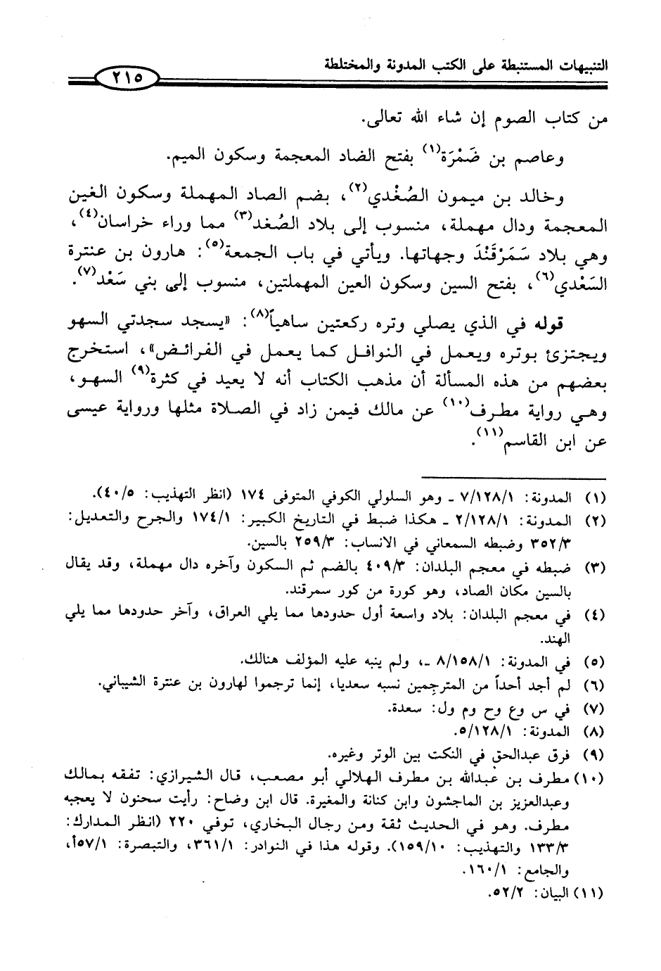 (¬1) المدونة: 1/ 128/ 7 - وهو السلولي الكوفي المتوفى 174 (انظر التهذيب: 5/ 40).