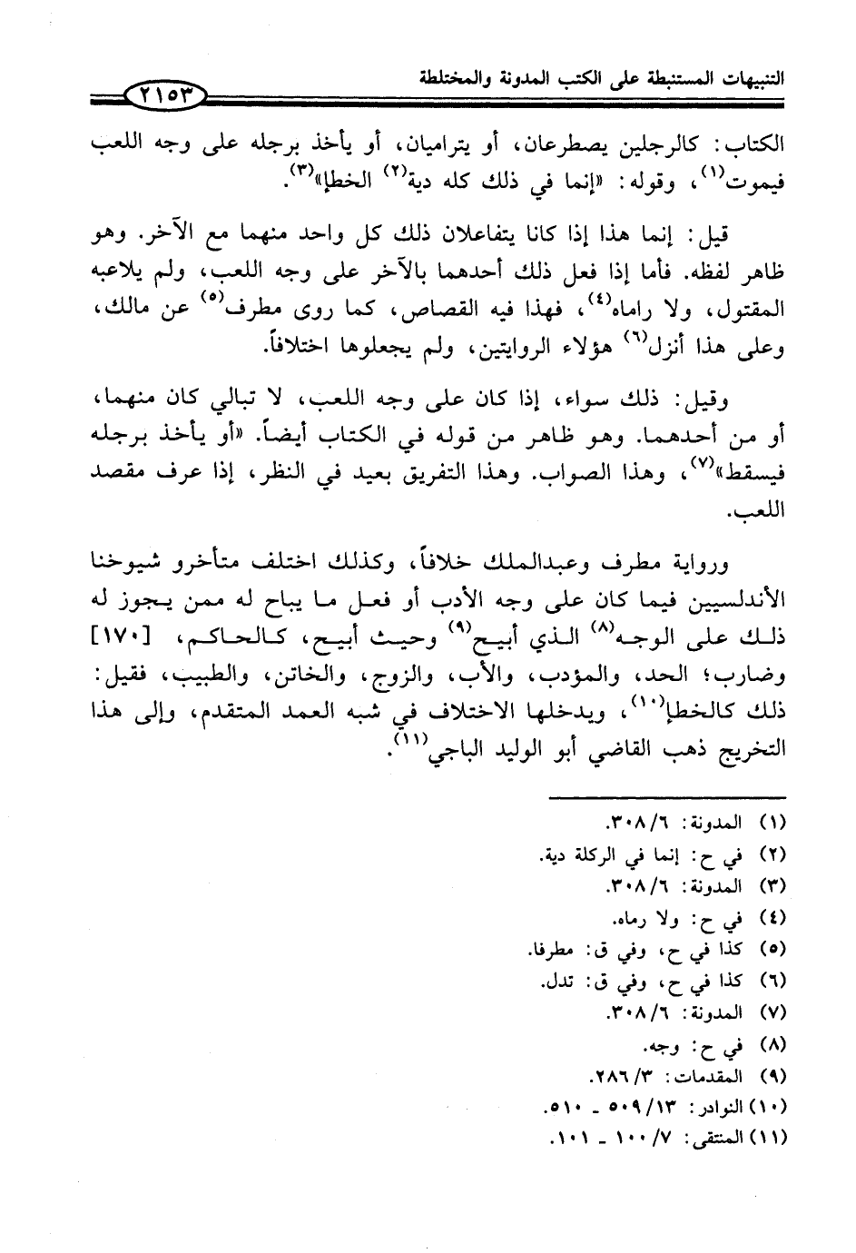 ورواية مطرف وعبد الملك خلافاً، وكذلك اختلف متأخرو شيوخنا الأندلسيين فيما كان على وجه الأدب أو فعل ما يباح له ممن يجوز له ذلك على الوجه (¬8) الذي أبيح (¬9) وحيث أبيح، كالحاكم، [170] وضارب؛ الحد، والمؤدب، والأب، والزوج، والخاتن، والطبيب، فقيل: ذلك كالخطإ (¬10)، ويدخلها الاختلاف في شبه العمد المتقدم، وإلى هذا التخريج ذهب القاضي أَبو الوليد الباجي (¬11).