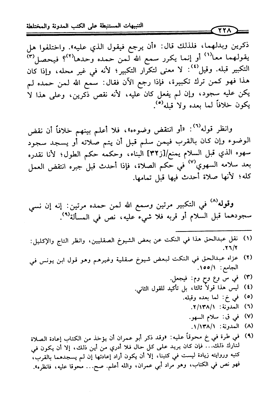 (¬9) في طرة في خ محوقاً عليه: "وقد ذكر أبو عمران أن يؤخذ من الكتاب إعادة الصلاة لتارك ذلك ... فإن كان يريد على كل حال فلا أدري من أين ذلك، إلا أن يكون في كتبه وروايته زيادة ليست في كتبنا، إلا أن يكون أراد إعادتها إن لم يسجدهما بالقرب، فهو نص في الكتاب، وهو مراد أبي عمران، والله أعلم. صح ... محوقا عليه، فانظره".