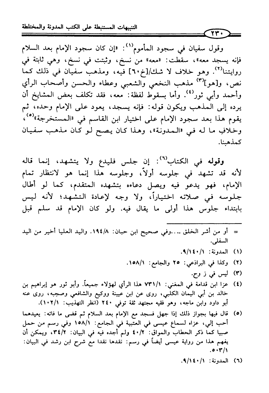 (¬5) قال فيها بجواز ذلك إذا جهل فسجد مع الإِمام بعد السلام ثم قضى ما فاته: يعيدهما أحب إلي، عزاه لسماع عيسى في العتبية في الجامع: 1/ 158 وفي رسم من حمل صبيا كما ذكر الحطاب والمواق: 2/ 40 ولم أجده فيه في البيان: 2/ 34، ويمكن أن يفهم هذا من رواية عيسى أيضاً في رسم: نقدها نقدا مع شرح ابن رشد في البيان: 1/ 503.