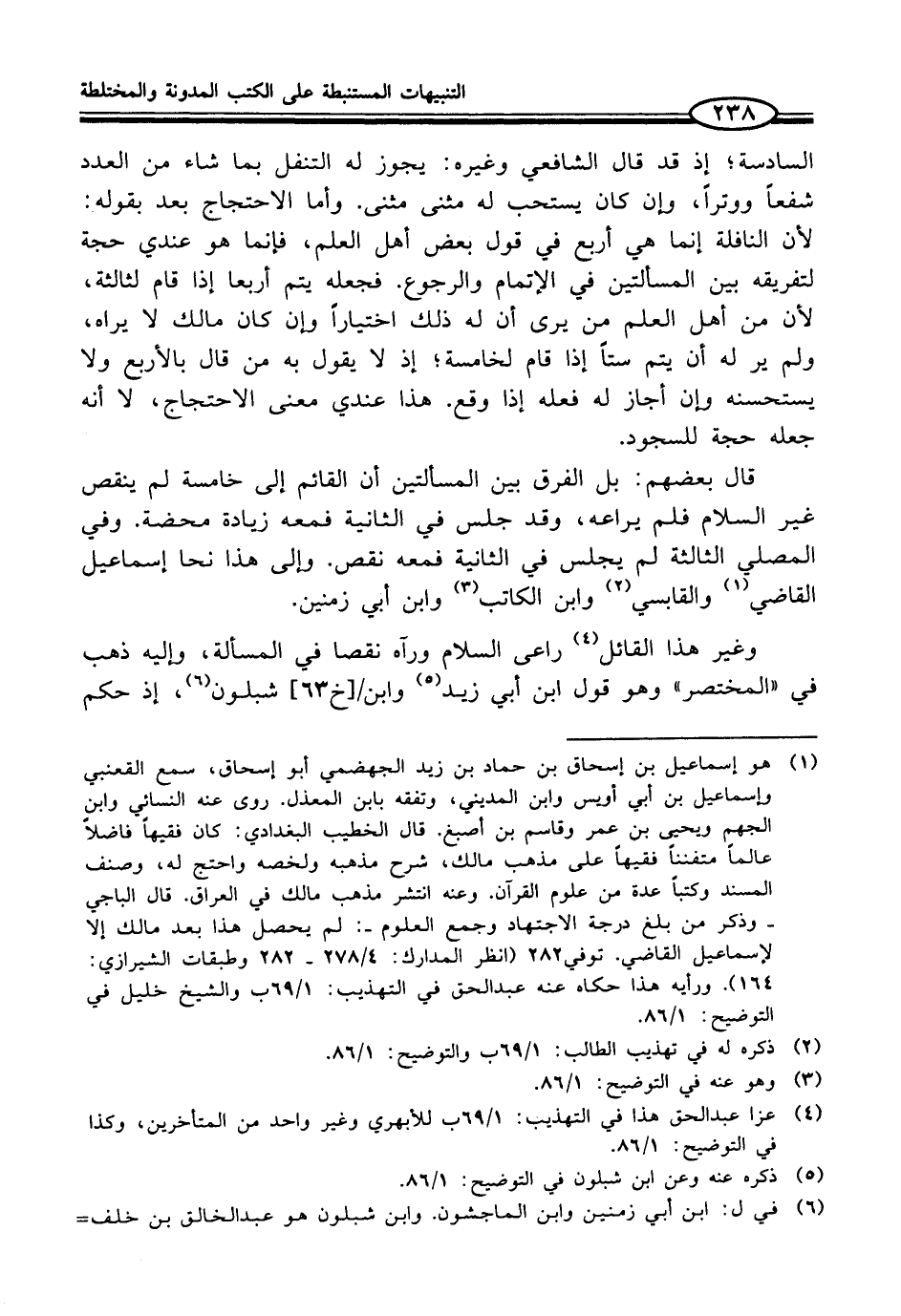 (¬1) هو إسماعيل بن إسحاق بن حماد بن زيد الجهضمي أبو إسحاق، سمع القعنبي وإسماعيل بن أبي أويس وابن المديني، وتفقه بابن المعذل. روى عنه النسائي وابن الجهم ويحيى بن عمر وقاسم بن أصبغ. قال الخطيب البغدادي: كان فقيهاً فاضلاً عالماً متفنناً فقيهاً على مذهب مالك، شرح مذهبه ولخصه واحتج له، وصنف المسند وكتباً عدة من علوم القرآن. وعنه انتشر مذهب مالك في العراق. قال الباجي - وذكر من بلغ درجة الاجتهاد وجمع العلوم -: لم يحصل هذا بعد مالك إلا لإسماعيل القاضي. توفي 282 (انظر المدارك: 4/ 278 - 282 وطبقات الشيرازي: 164). ورأيه هذا حكاه عنه عبد الحق في التهذيب: 1/ 69 ب والشيخ خليل في التوضيح: 1/ 86.