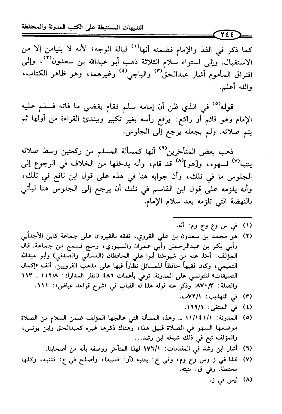 (¬5) المدونة: 1/ 141/ 11 - . وهذه المسألة التي عالجها المؤلف ضمن السلام من الصلاة موضعها السهو في الصلاة قبيل هذا، وهناك ذكرها غيره كعبد الحق وابن يونس، والمؤلف تبع في ذلك شيخه ابن رشد ...