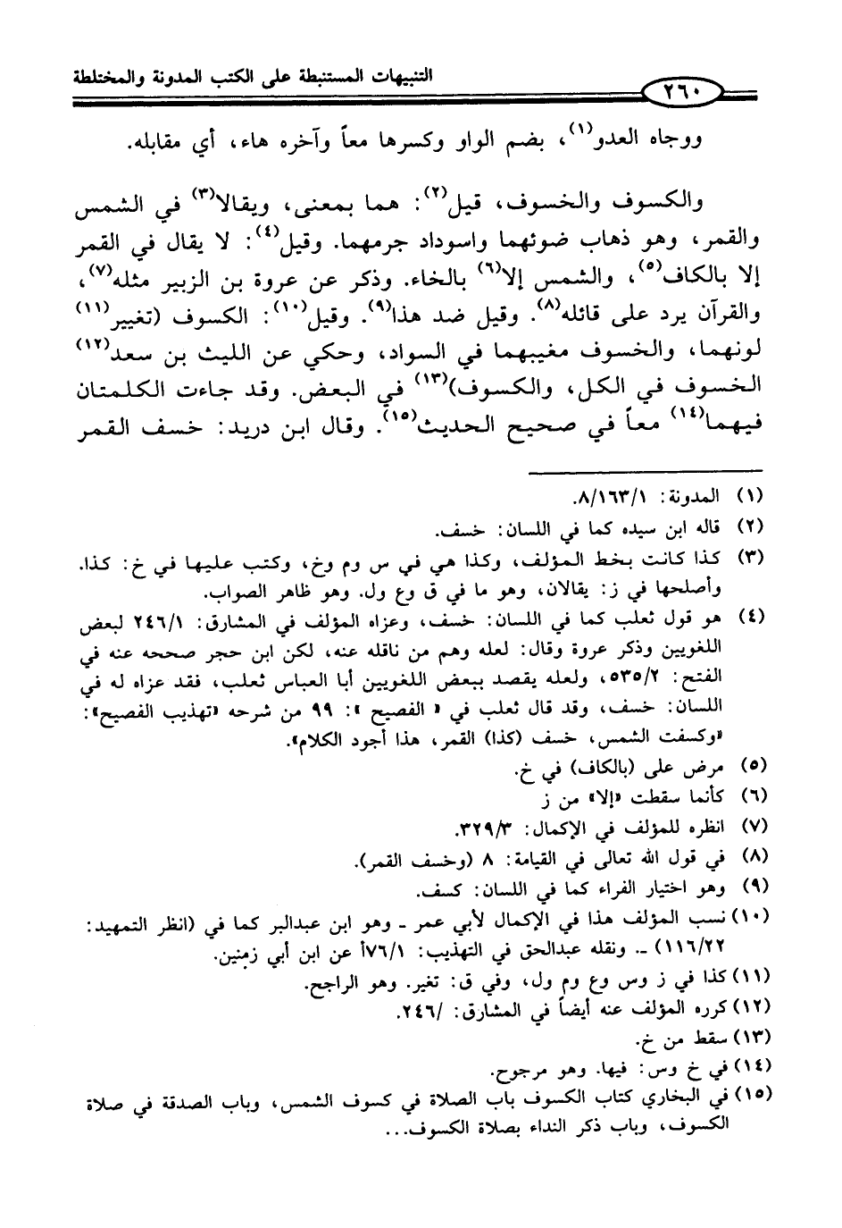 (¬4) هو قول ثعلب كما في اللسان: خسف، وعزاه المؤلف في المشارق: 1/ 246 لبعض اللغويين وذكر عروة وقال: لعله وهم من ناقله عنه، لكن ابن حجر صححه عنه في الفتح: 2/ 535، ولعله يقصد ببعض اللغويين أبا العباس ثعلب، فقد عزاه له في اللسان: خسف، وقد قال ثعلب في "الفصيح": 99 من شرحه "تهذيب الفصيح": "وكسفت الشمس، خسف (كذا) القمر، هذا أجود الكلام".