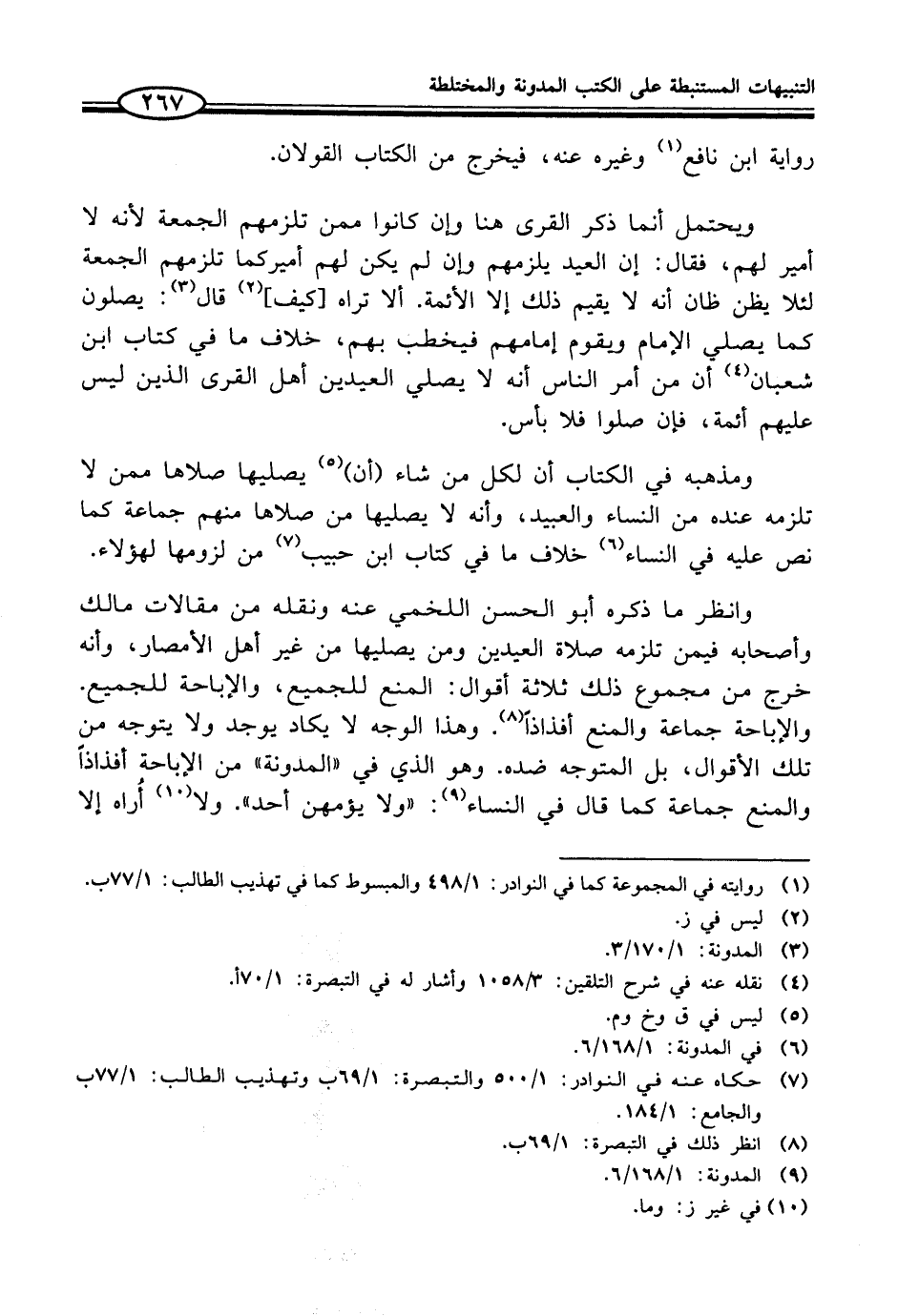 وانظر ما ذكره أبو الحسن اللخمي عنه ونقله من مقالات مالك وأصحابه فيمن تلزمه صلاة العيدين ومن يصليها من غير أهل الأمصار، وأنه خرج من مجموع ذلك ثلاثة أقوال: المنع للجميع، والإباحة للجميع. والإباحة جماعة والمنع أفذاذاً (¬8). وهذا الوجه لا يكاد يوجد ولا يتوجه من تلك الأقوال، بل المتوجه ضده. وهو الذي في "المدونة" من الإباحة أفذاذاً والمنع جماعة كما قال في النساء (¬9): "ولا يؤمهن أحد". ولا (¬10) أُراه إلا