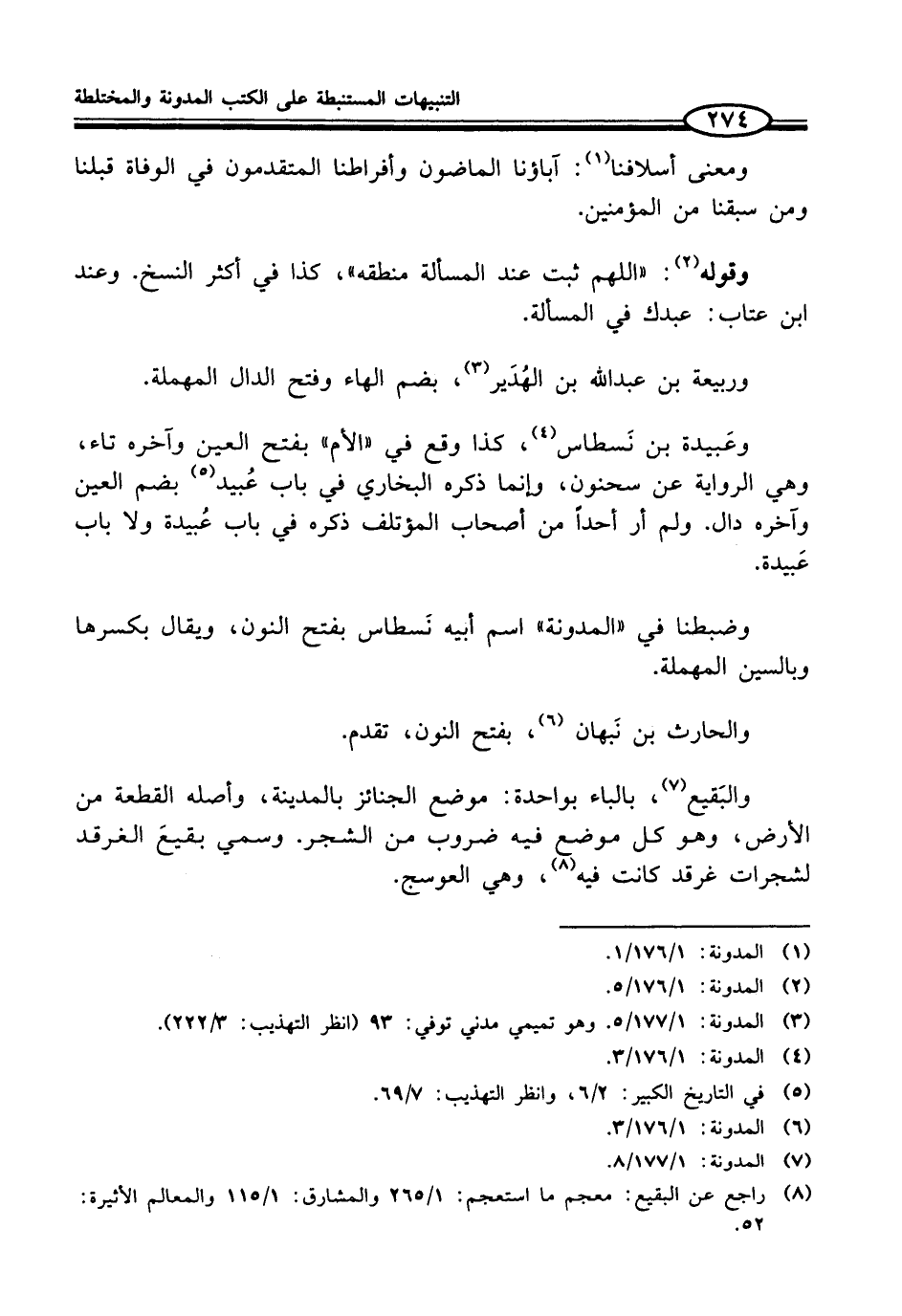 وعَبيدة بن نَسطاس (¬4)، كذا وقع في "الأم" بفتح العين وآخره تاء، وهي الرواية عن سحنون، وإنما ذكره البخاري في باب عُبيد (¬5) بضم العين وآخره دال. ولم أر أحداً من أصحاب المؤتلف ذكره في باب عُبيدة ولا باب عَبيدة.