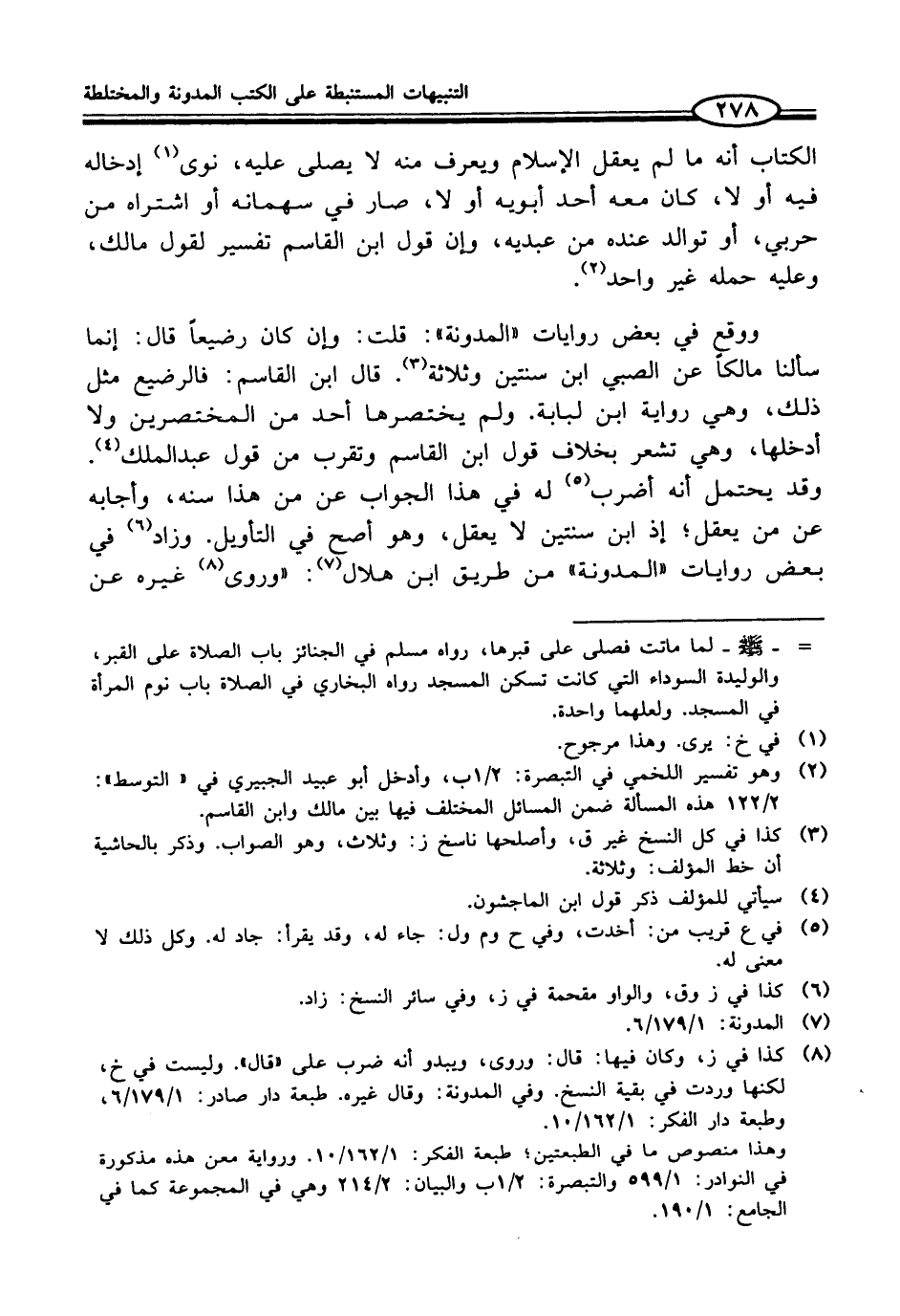 الكتاب أنه ما لم يعقل الإِسلام ويعرف منه لا يصلى عليه، نوى (¬1) إدخاله فيه أو لا، كان معه أحد أبويه أو لا، صار في سهمانه أو اشتراه من حربي، أو توالد عنده من عبديه، وإن قول ابن القاسم تفسير لقول مالك، وعليه حمله غير واحد (¬2).